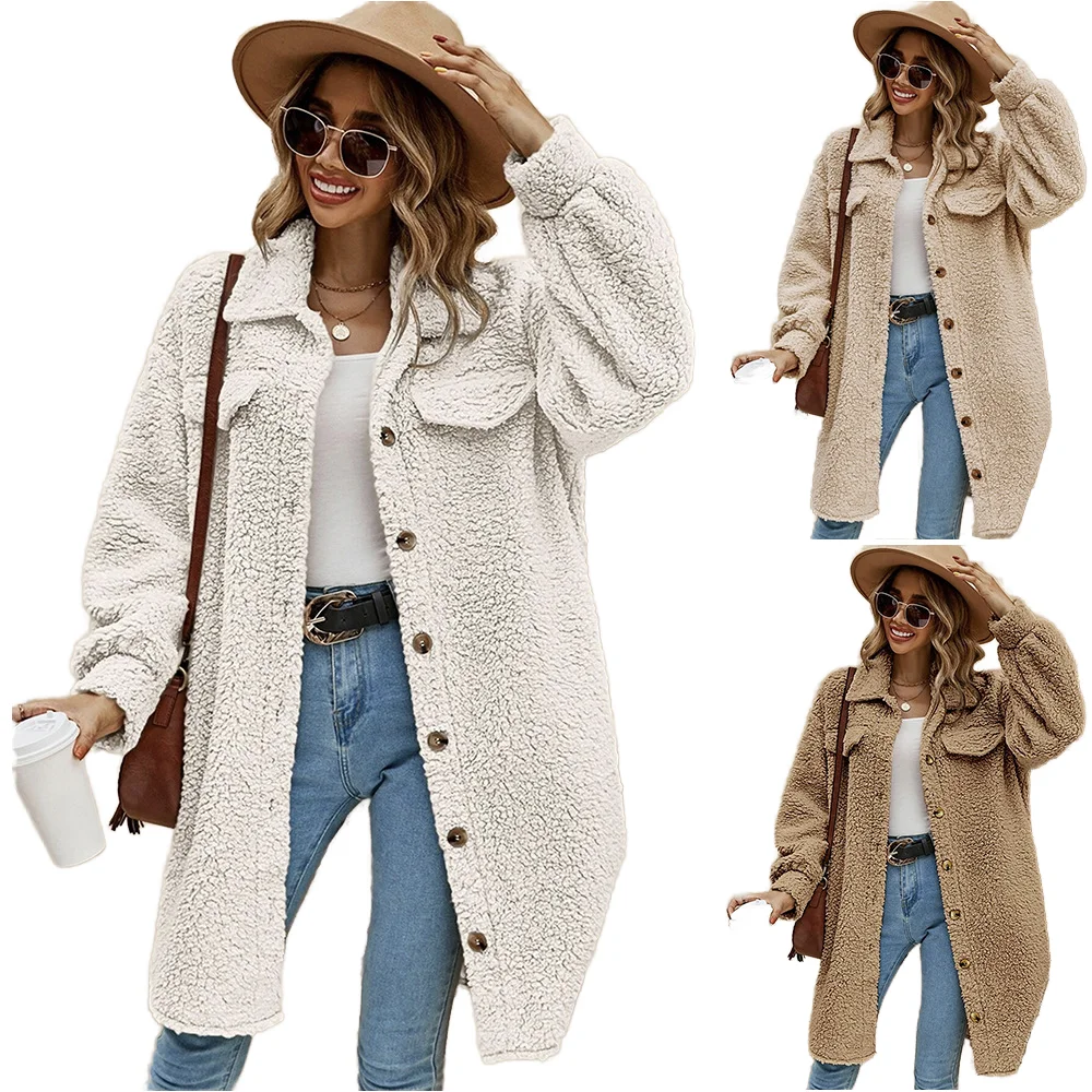 Women's Winter Long Coat Single Button New Style Plush Material Turndown Collar Solid Color Loose Fit Casual Streetwear Keep