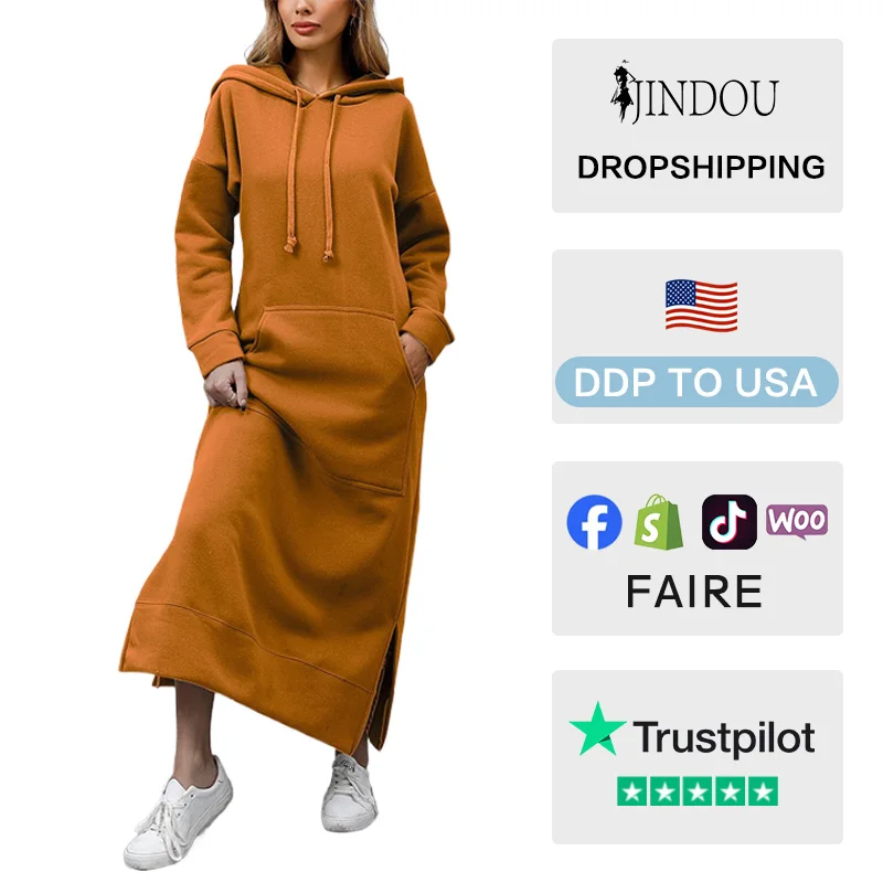 New Arrival Women Loose Plus Size Knitted Long Dress Fleece Sweatshirt Oversize Blank Long Kangaroo Pocket Hoodie Dresses