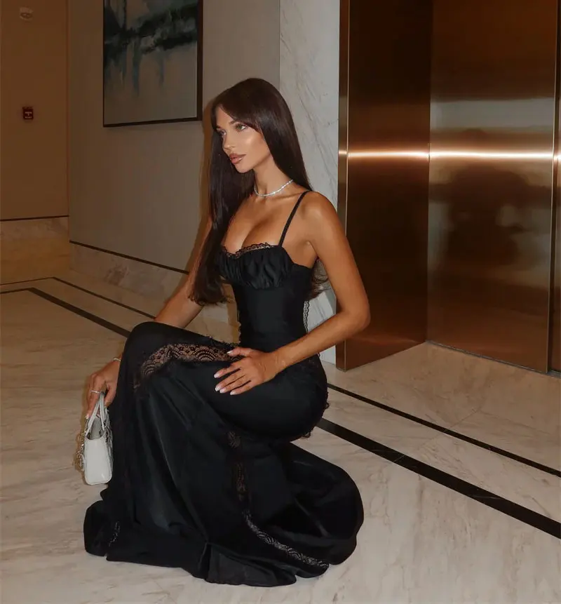 Spaghetti Strap Backless Sexy Maxi Dress Women Gown Lace Patchwork Sheer Sleeveless Bodycon Club Party Long Dress