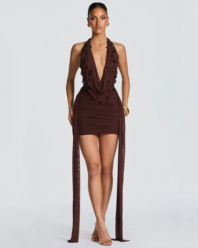 Halter Deep V Neck Backless Sexy Mini Dress Women Teardrop Crystals Off-shoulder Draped Ruched Skinny Club Party Dress