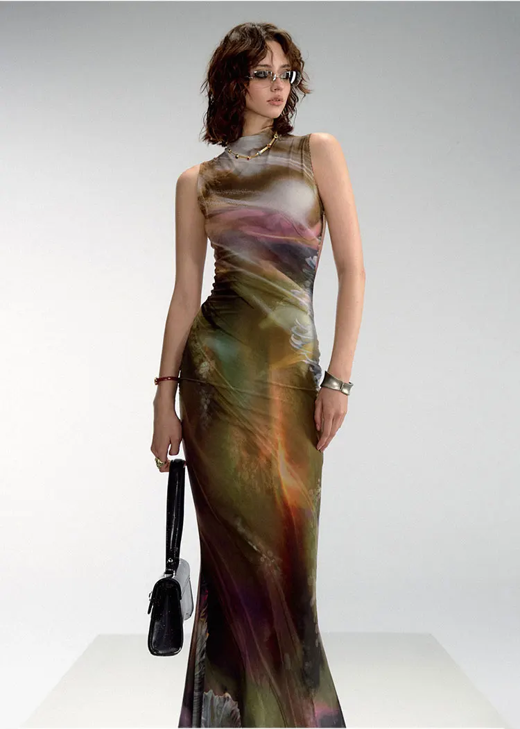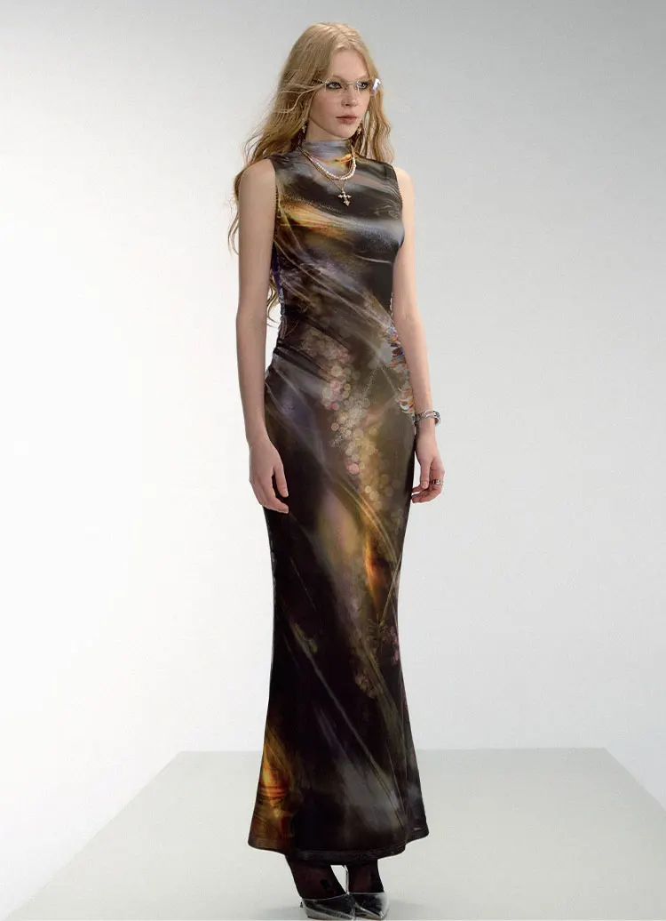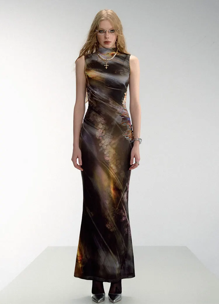 Mesh Printing Double Layer Elegant Women Maxi Dress Fashion Sexy Bodycon Club Party Evening Long Dress