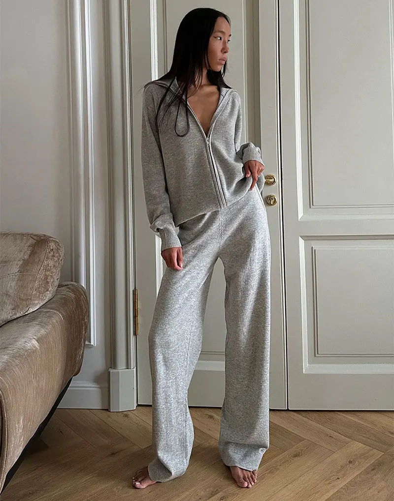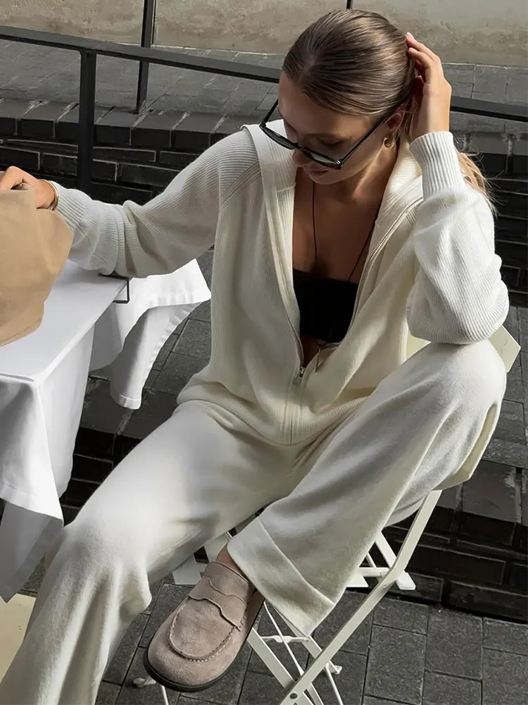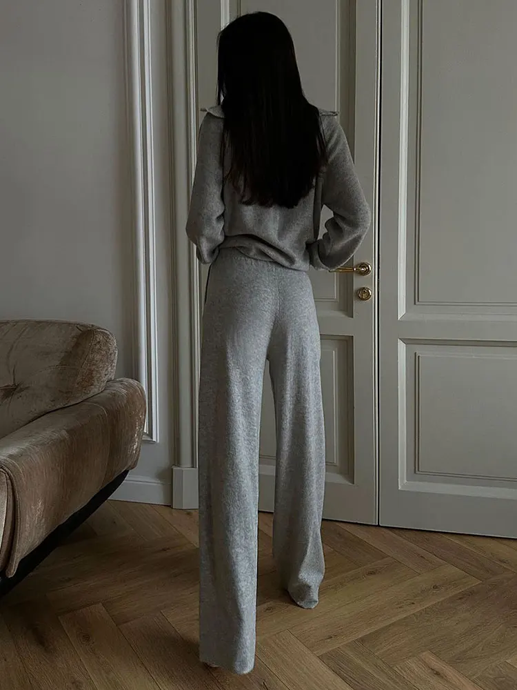 Knitted Women's Two Piece Pant Set Zip Cardigan Sweater and Wide Leg Pants Soft Loose Autumn Winter Fashion Matching Sets