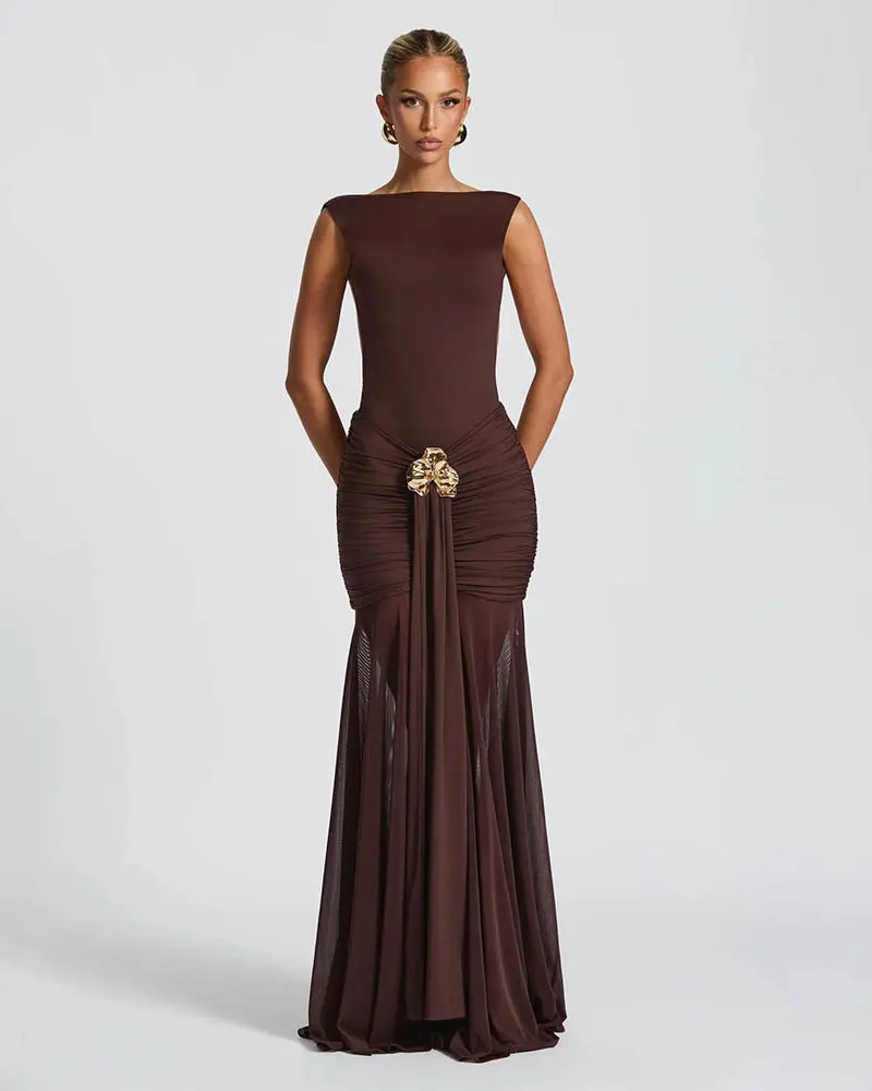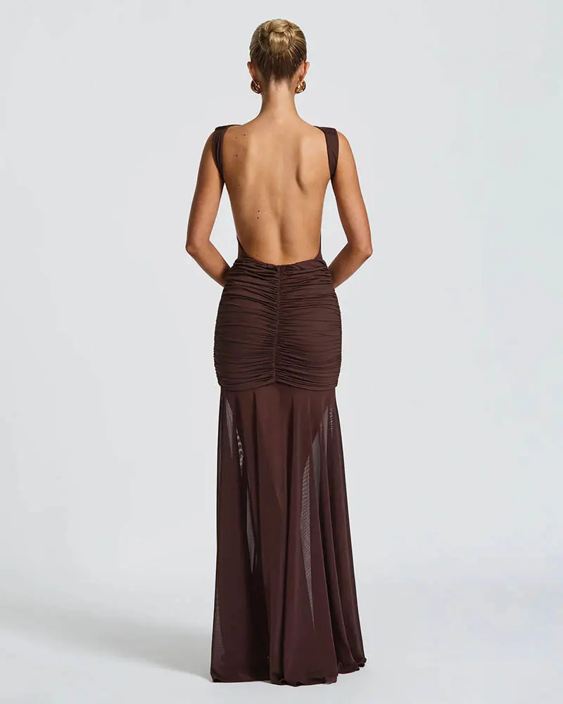 Mesh Patchwork Backless Ruched Sexy Maxi Dress for Women Gown Elegant Backless Bodycon Club Party Long Dress