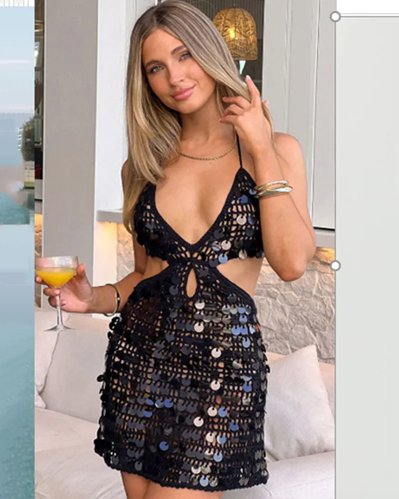 Crochet Shiny Sequins Sexy Mini Dress Summer Y2K Hollow Out Backless Knitted Bikini Cover-Up Holiday Beach Party Dress