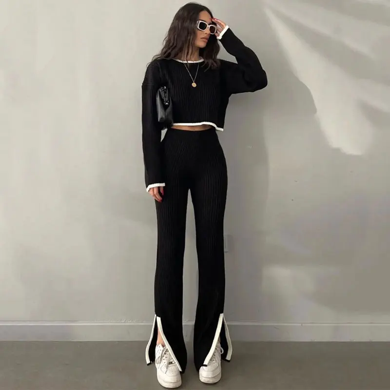 2023 Autumn Winter Knitted O-Neck Long Sleeve Sweater Top and Splice Pant Women Two Piece Pant Set