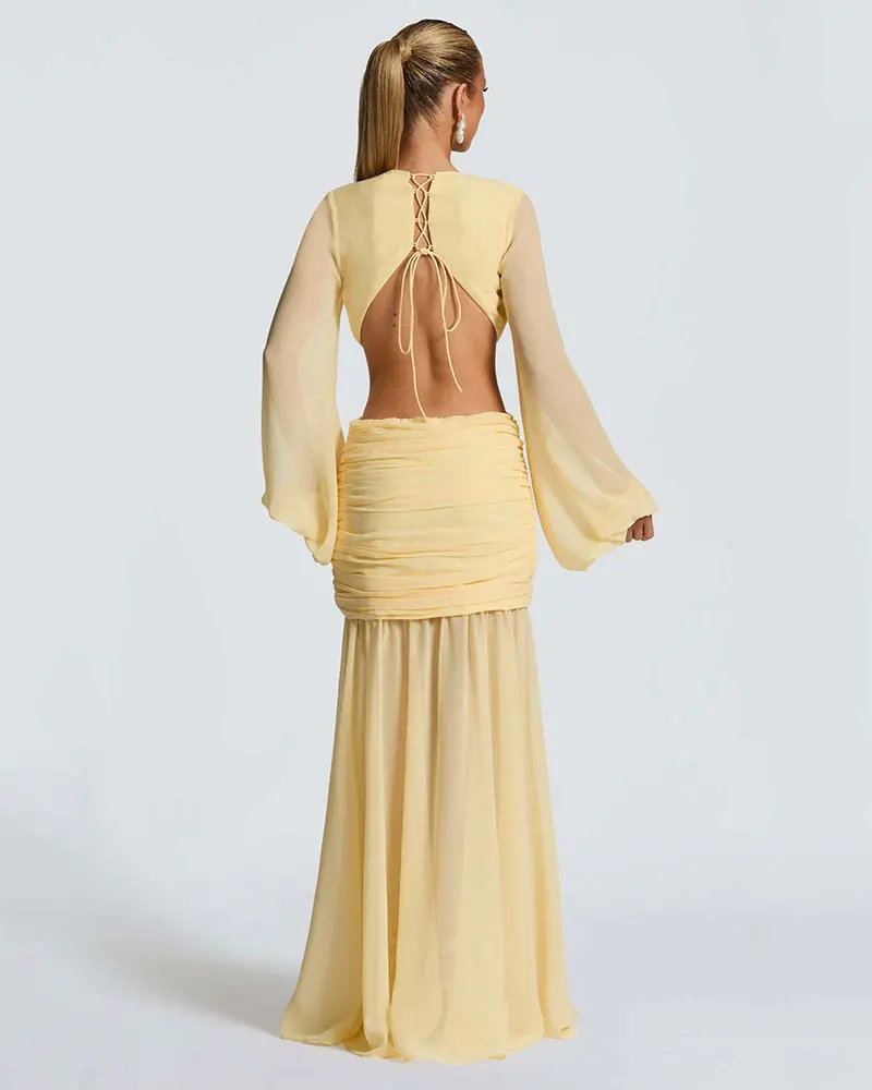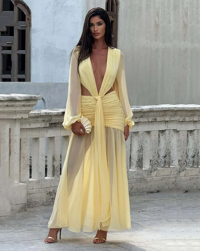 Elegant Chiffon Maxi Dress for Women New Lantern Sleeve Gowns Pleated Sexy Club Party Bodycon Long Dresses