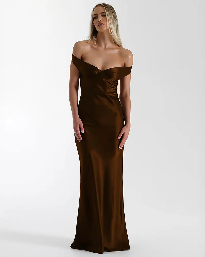 ZYHT 73905 Dusty Rose Off-The-Shoulder Long Sleeve Stretch Jersey Dress Ruched Bodice Floor Length Fish Tail Maxi Dress