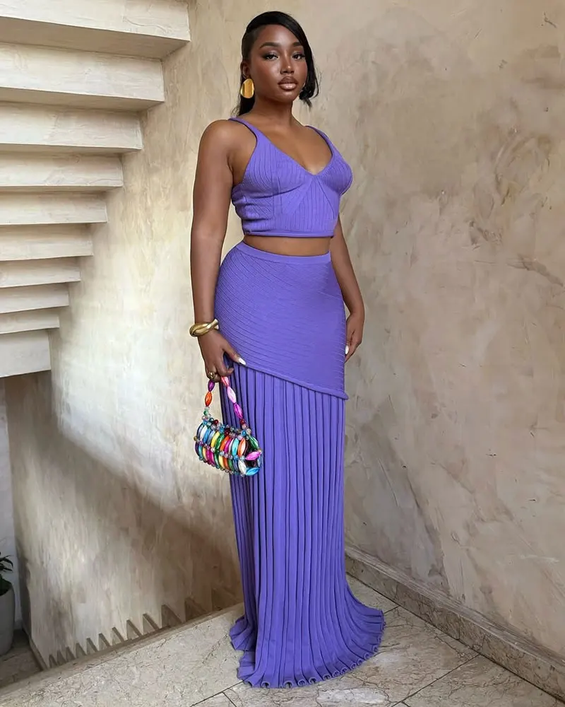 Knitted Pleats Dress Sets Women Streetwear Sexy Crop Top Vest and Maxi Skirts Summer Party Holidays Two Piece Skirts Sets