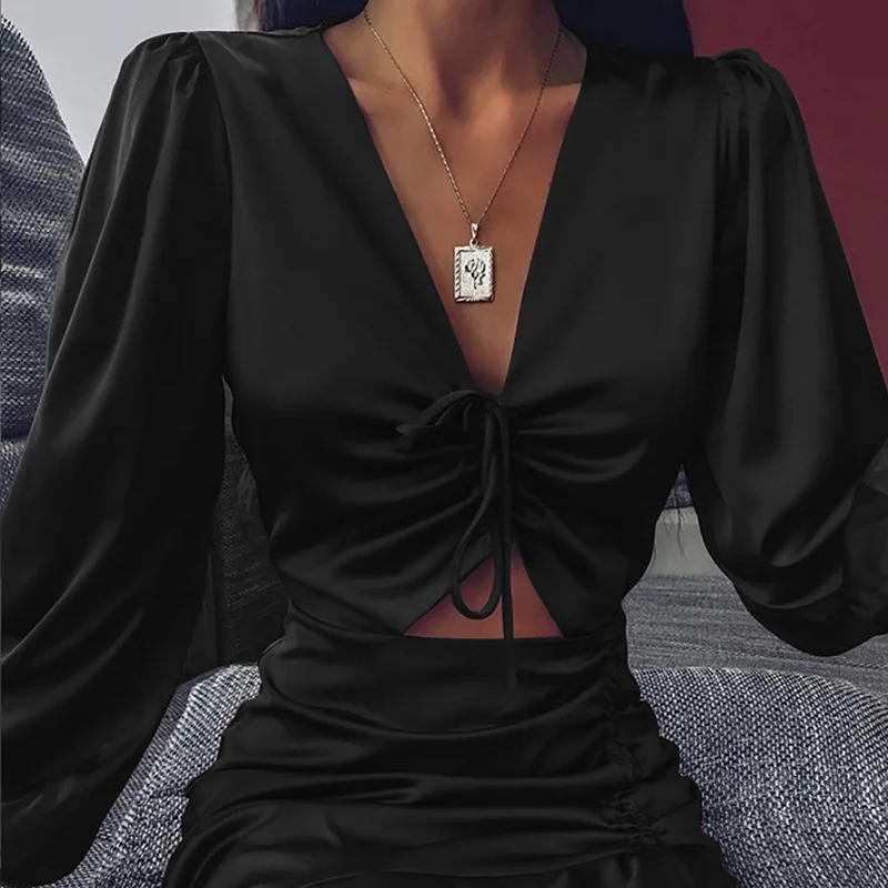 Satin Drawstring Sexy Bodycon Dresses for Women Casual Long Sleeve Elegant Party Dress