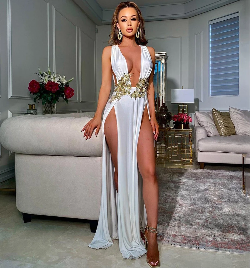 Sexy Summer Maxi Dress Sleeveless Lace Patch High Split Women Long Party Evening Dresses