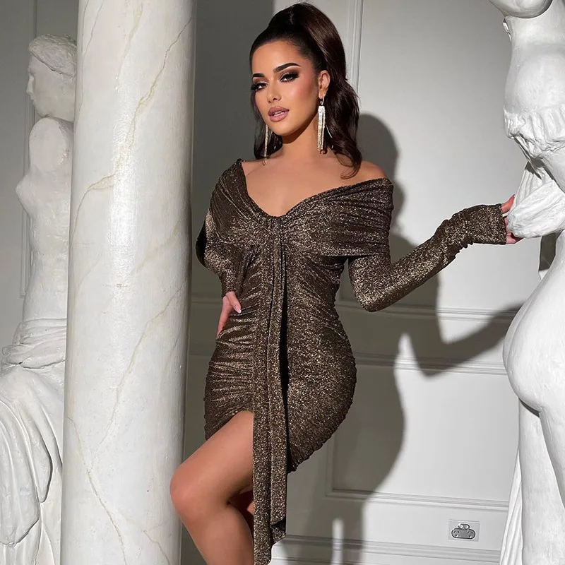 Fashion Long Sleeve Sexy Bodycon Dress for Women 2022 Autumn Winter Folds Elegant Evening Party Mini Dresses