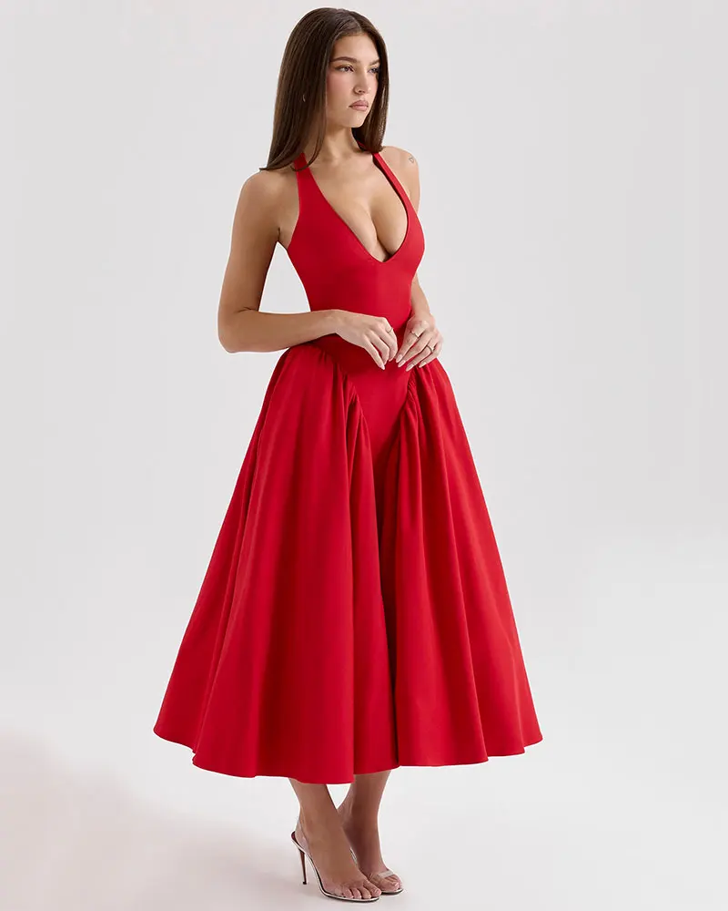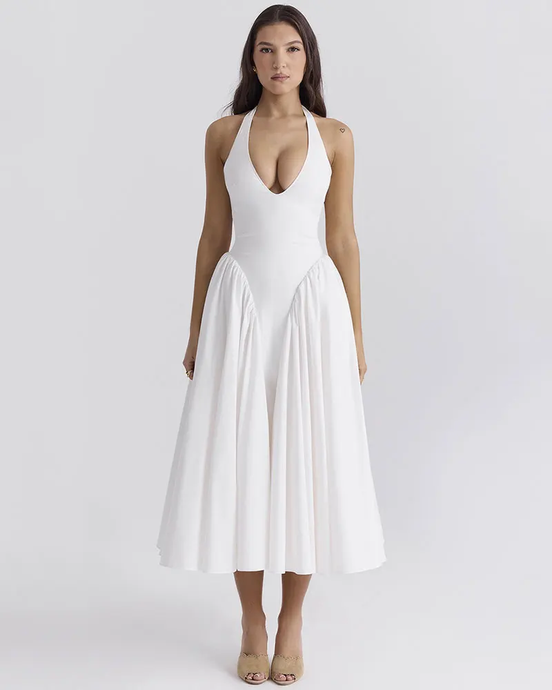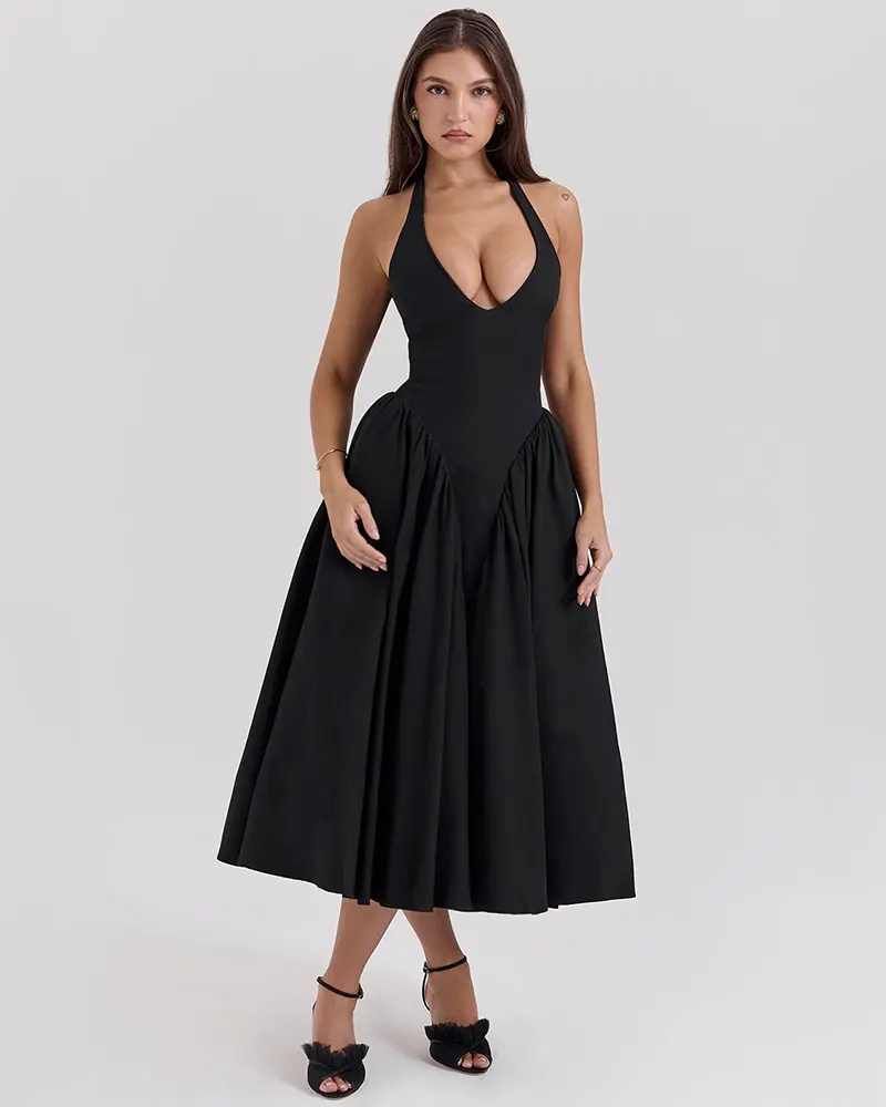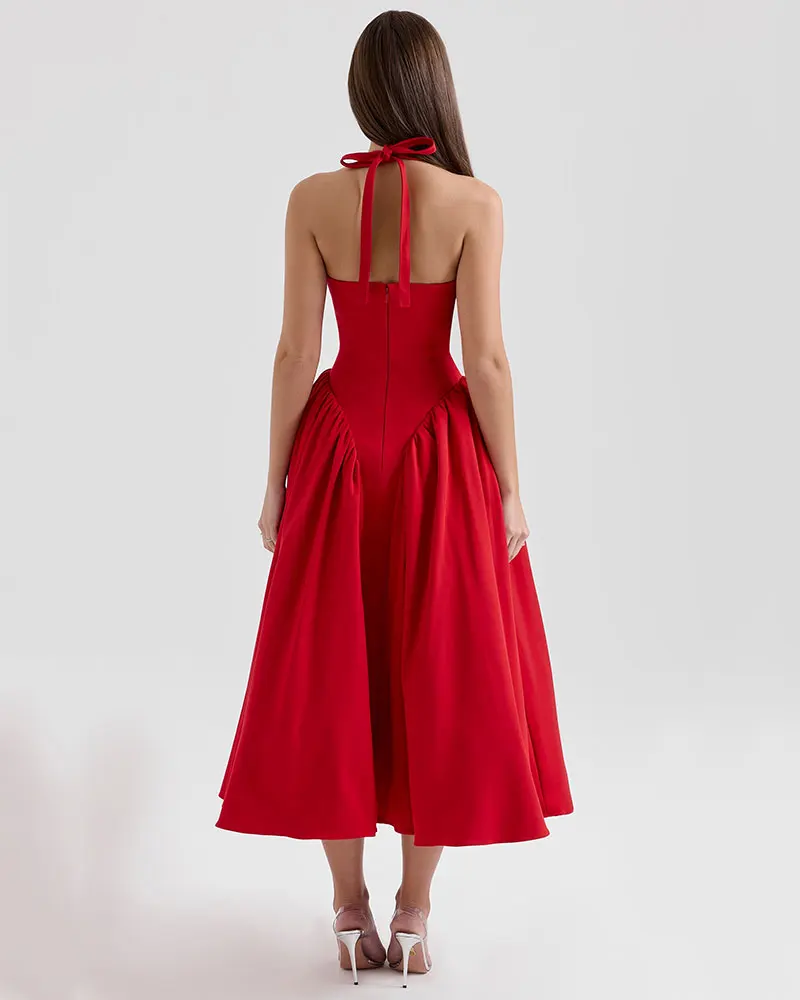 Halter Sexy Midi Long Dress for Women Summer Elegant Pleated Backless Club Party Evening Dress