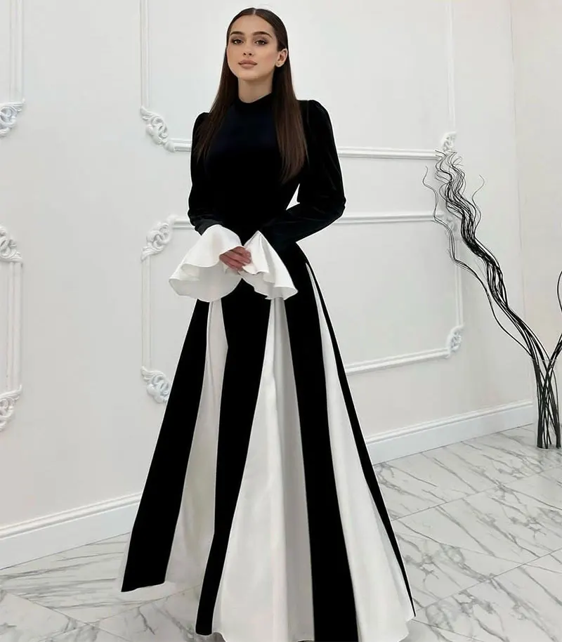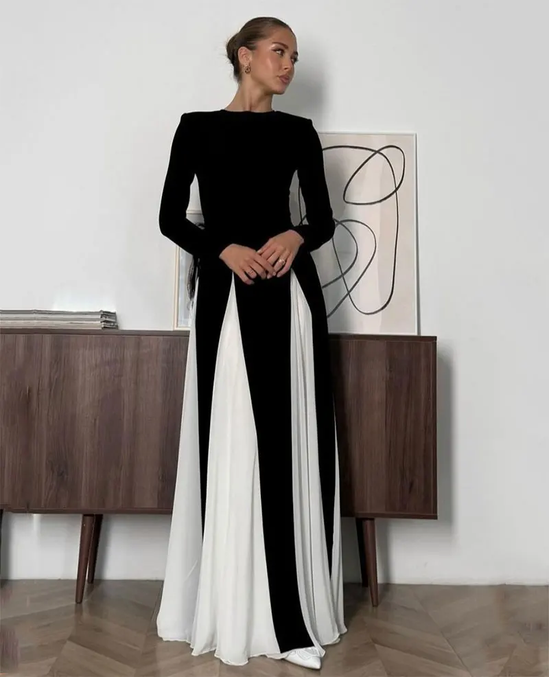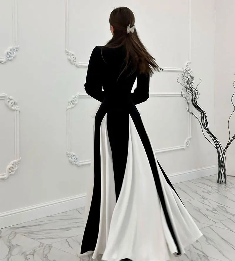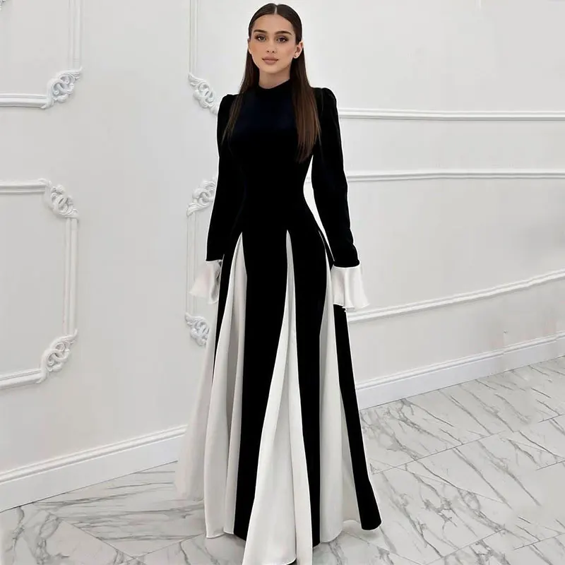 ZYHT 15325 Wholesale Spring Trendy Fashion Long Sleeve Dinner White Lace Black Velvet Elegant Party Dress Women Evening Dresses