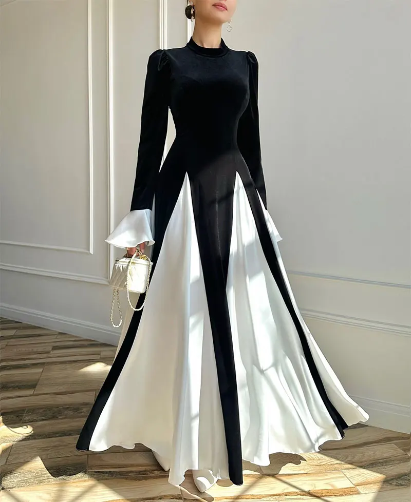 Vintage High Waist Pleated Maxi Dress Spring Autumn Flared Sleeves Ladies Elegant Patchwork Club Party Long Dress