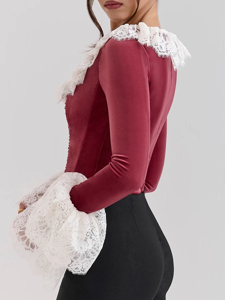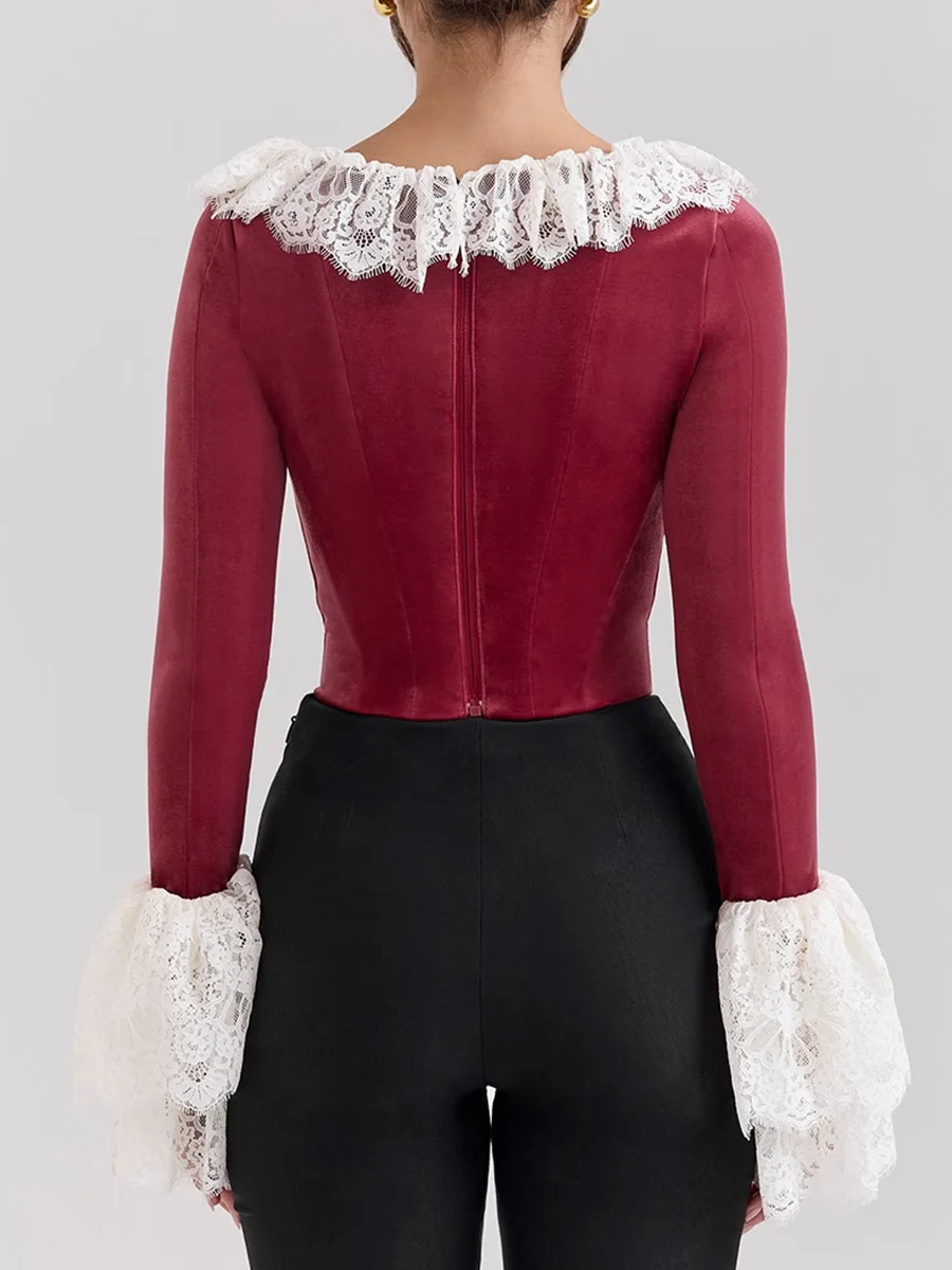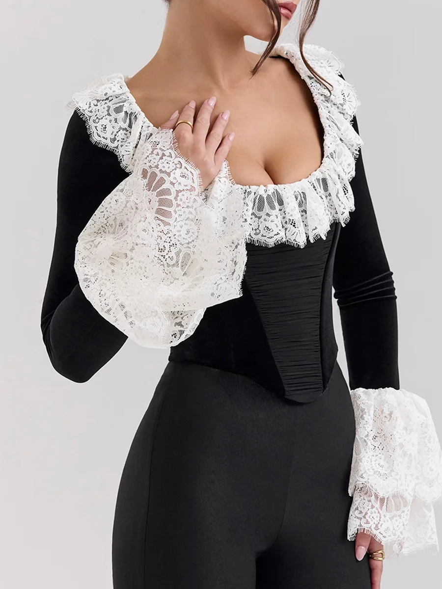 Lace Flare Long Sleeve Sexy Tops Women Fashion Square Collar Crop Tops Female Elegant Slim Fit Short T-shirt Tops