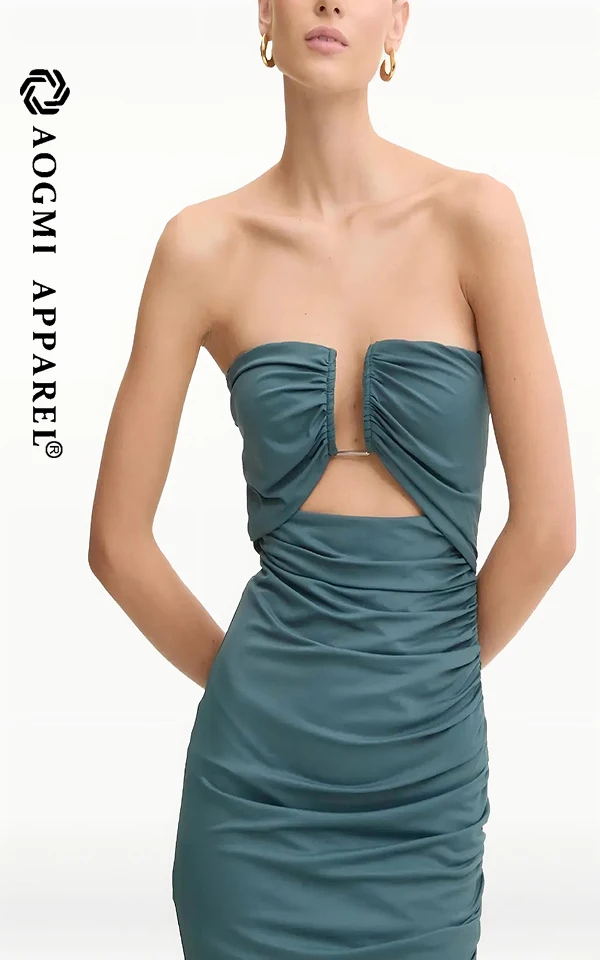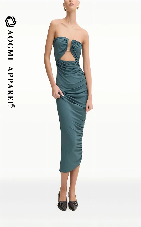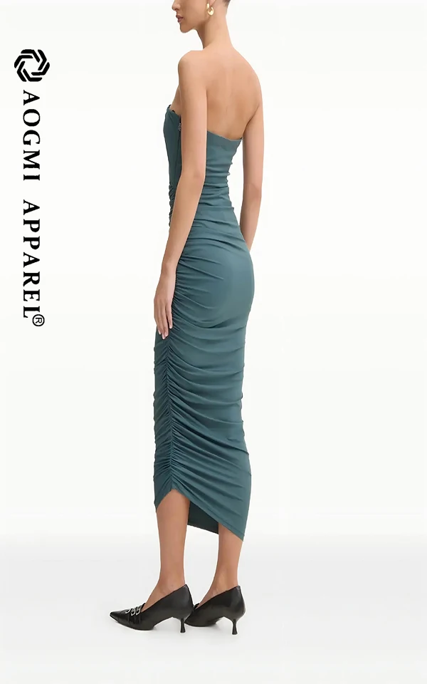 Haute Couture Luxury Fashion Ladies Sleeveless Off-the-Shoulder Neckline Slim Pleated Solid Color Midi Bodycon Satin Dress