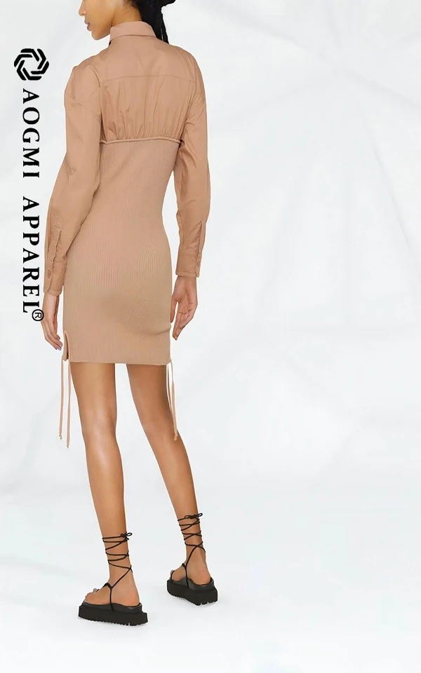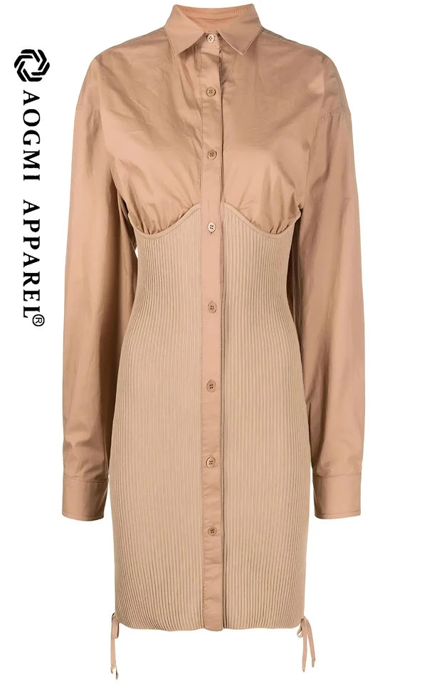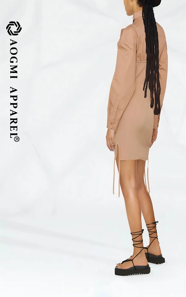 High-End Custom AOGMI Ladies Waist A-Line Thin Meat Cover Function Soft SAG Elastic Knitting Cotton Midi Long Sleeve Dress