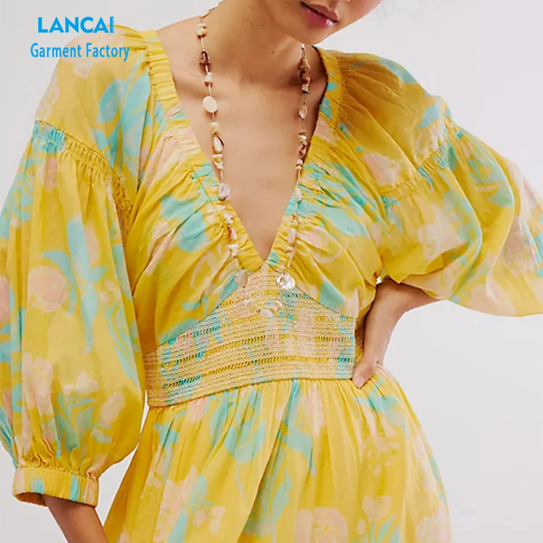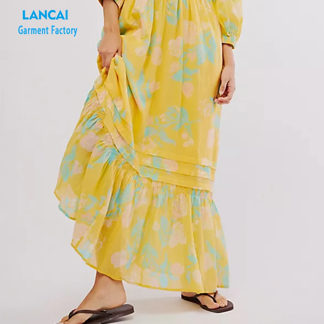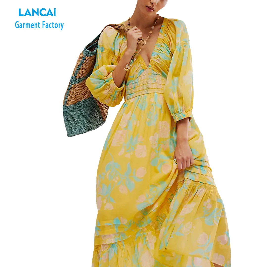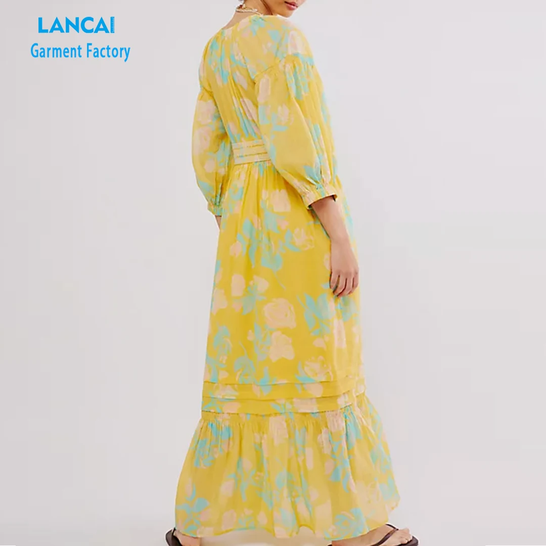 Custom Ladies Slim Long-sleeved Floral Skirt Hollow Out Floral Full Print Elegant Retro MIDI Dress Maxi Dress Women