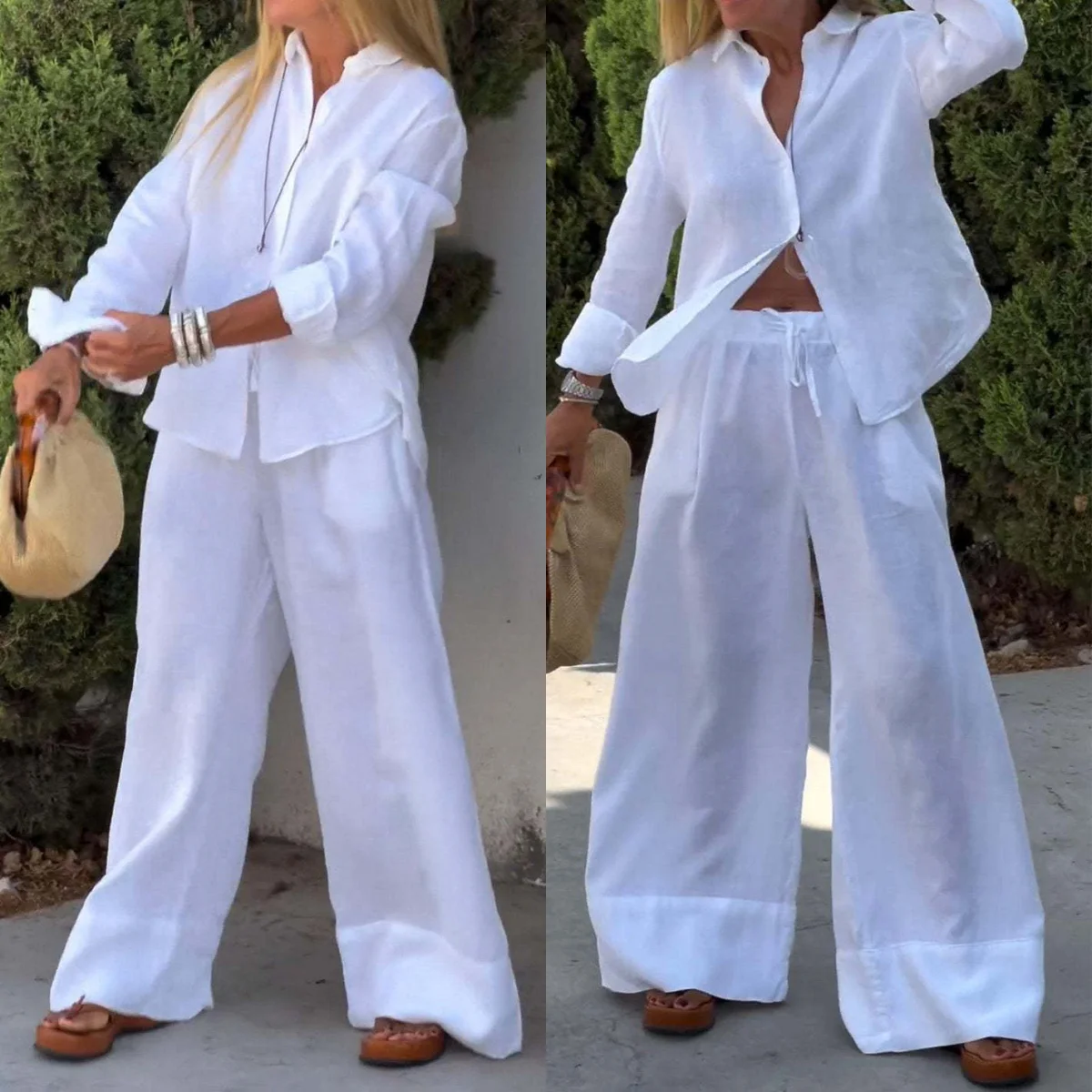 Latest Design Boutique Vintage Style Autumn Clothes Boutique Linen Long Sleeve Pocket Shirt and Wide Leg Pant 2 Piece Set Women