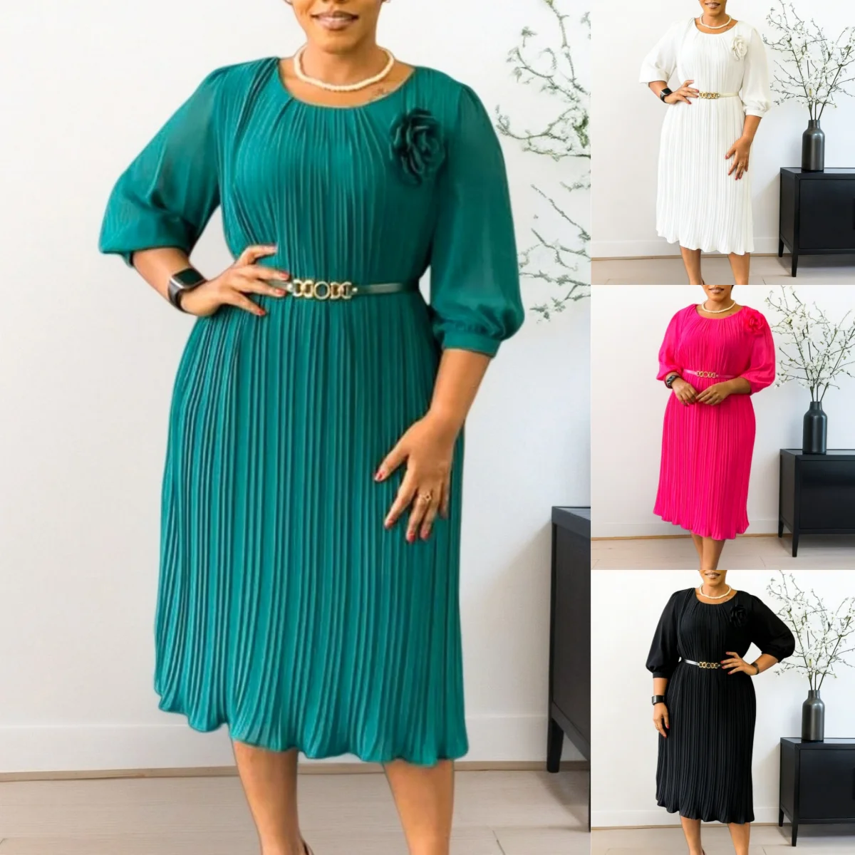 D614 Fashion Summer Dresses Women Casual 3/4 Sleeve O-neck Pleated Office Lady Dress Elegant African Dresses for Women With Belt
