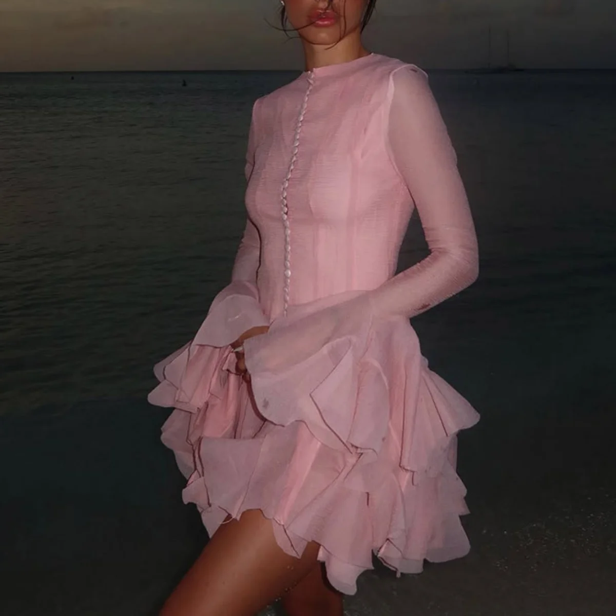 XTDY581 Fashion Ladies Autumn Ruffle Petal Long Sleeve Single Breasted Short Dresses Sexy and Elegant Ruffled Dress for Women