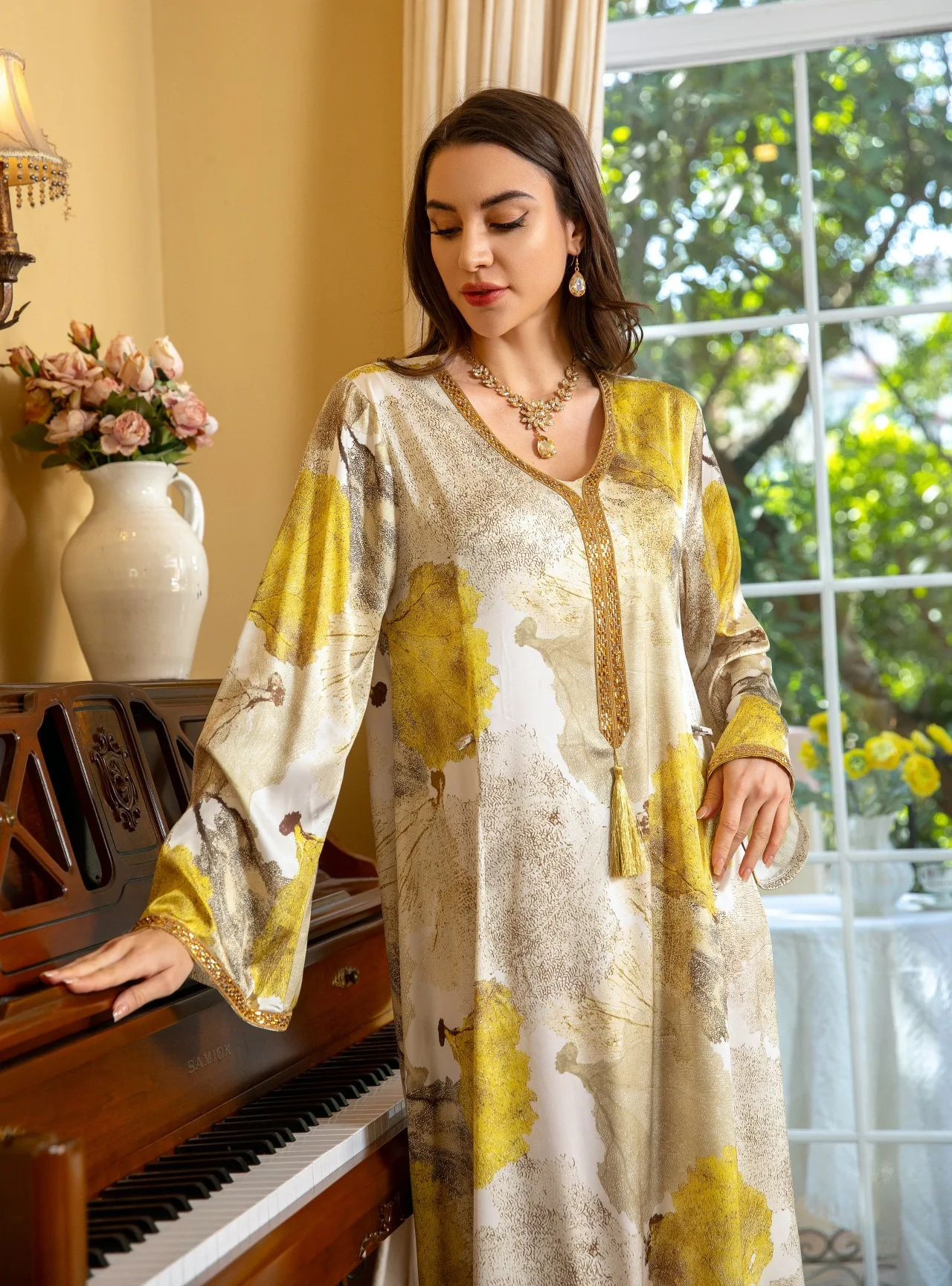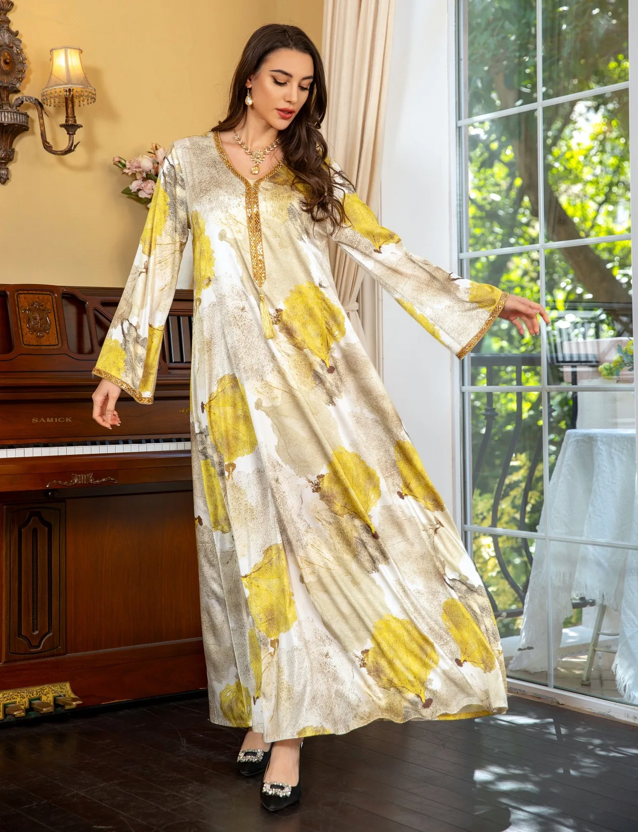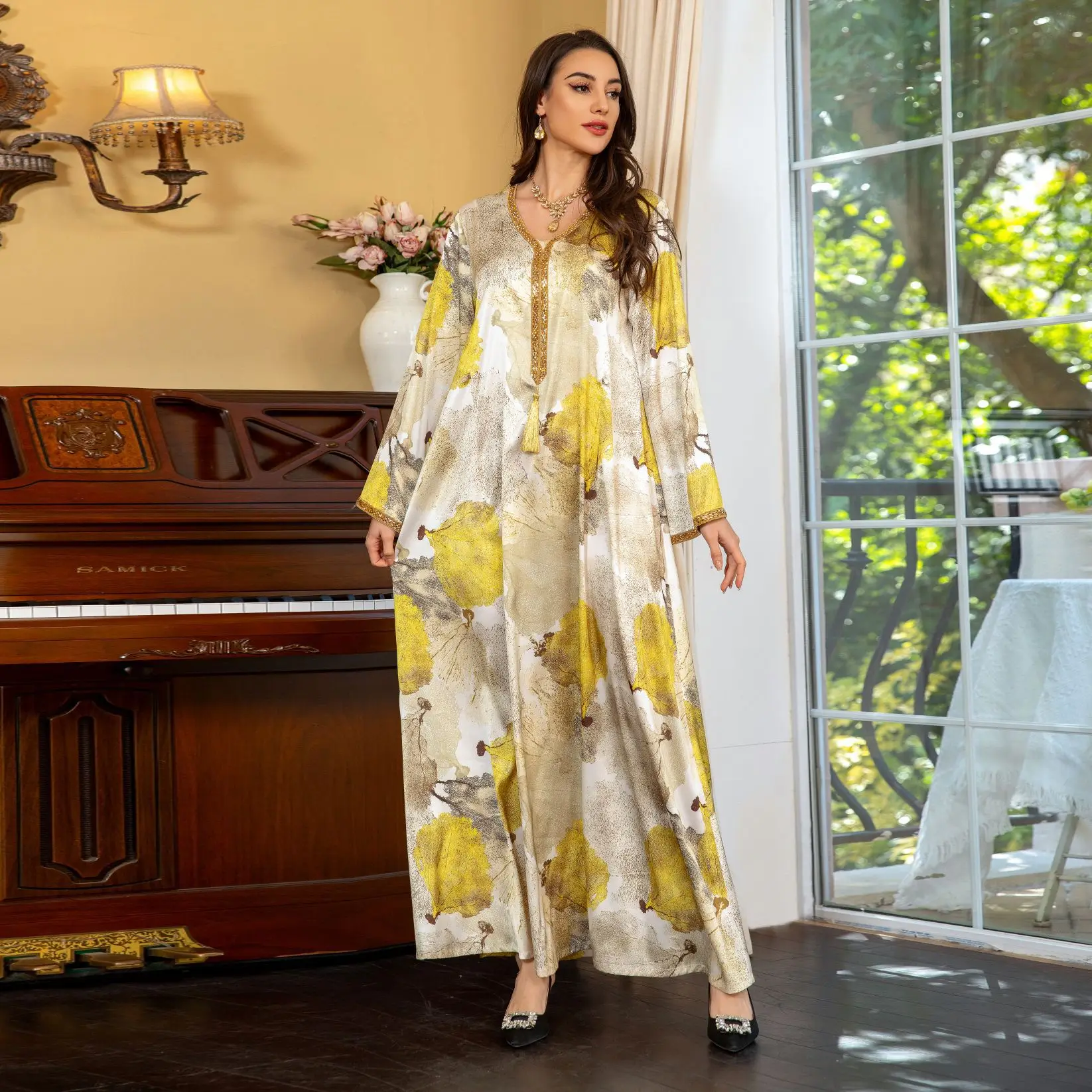 ZYHT 73571 Custom Elegant V-Neck Cape Sleeve Dresses Trendy Straight Yellow Maxi Party Gowns Modest Evening Dress for Women