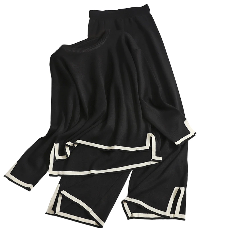 Wholesale 2026 Autumn Fashion New Temperament Contrast Split Long Sleeve Knitwear High Waist Slim Wide Leg Pants Women's Set