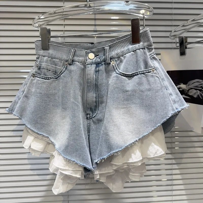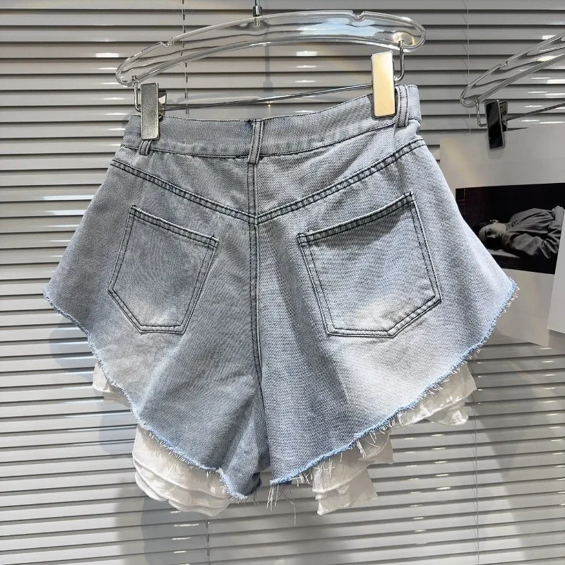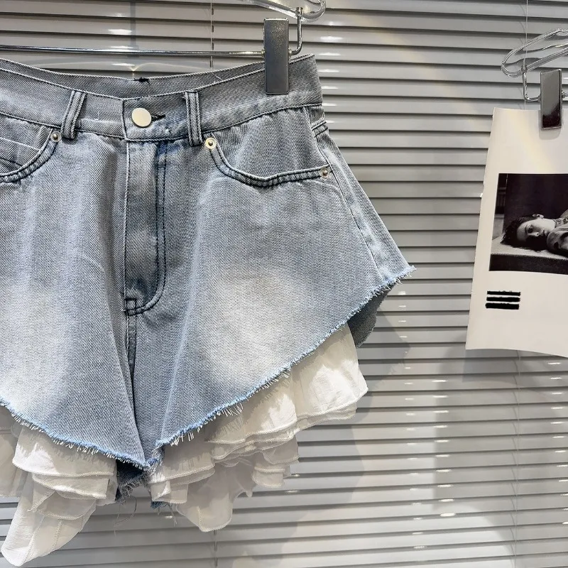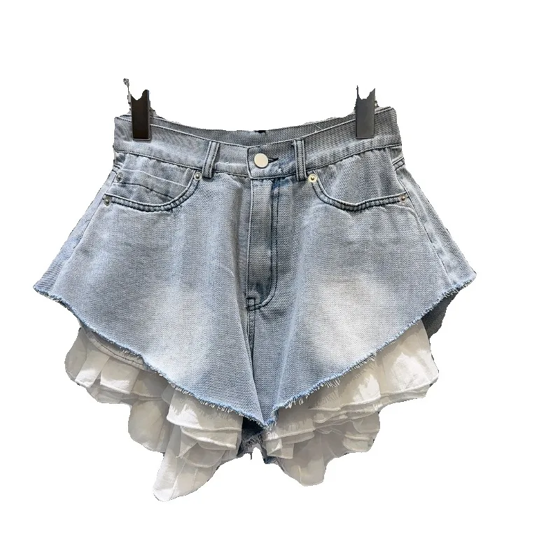 Wholesale Spring 2026 New Fashion Elegant Temperament Personality Sexy Lace Polished White Wide Leg Women's Denim Shorts