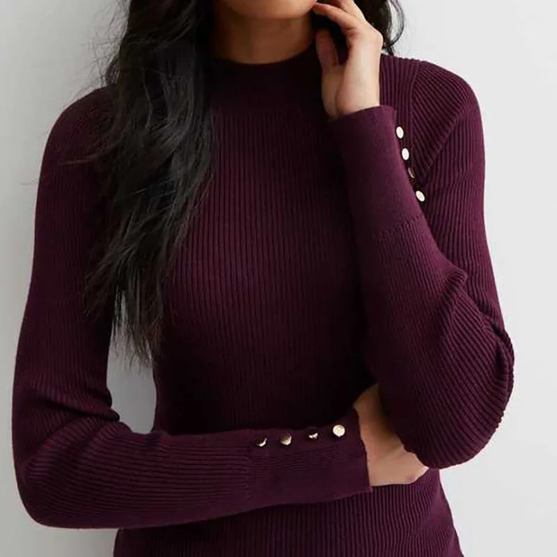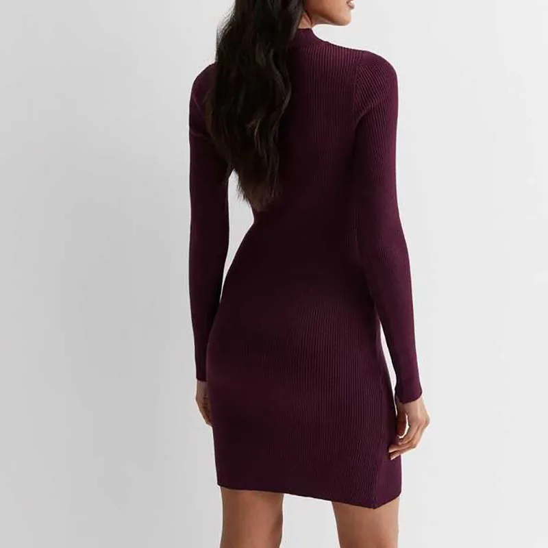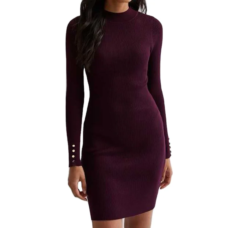 Custom Ribbed Knit Button Cuff Bodycon High Neckline Womens Mini Dress