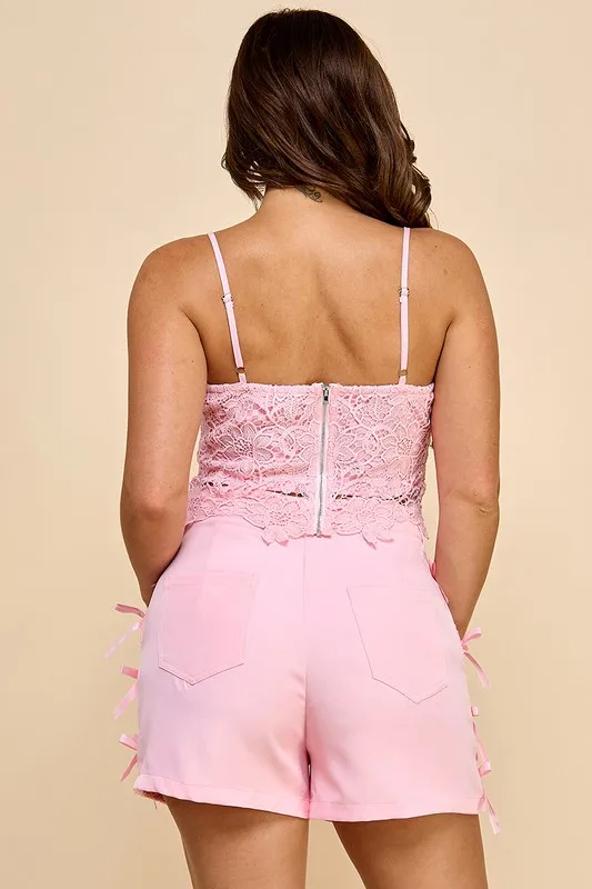 Women's Retro Embroidered Floral Pattern Lace Two-piece Set Pink Camisole + High-waist Shorts for Summer Vacation Photos/Island
