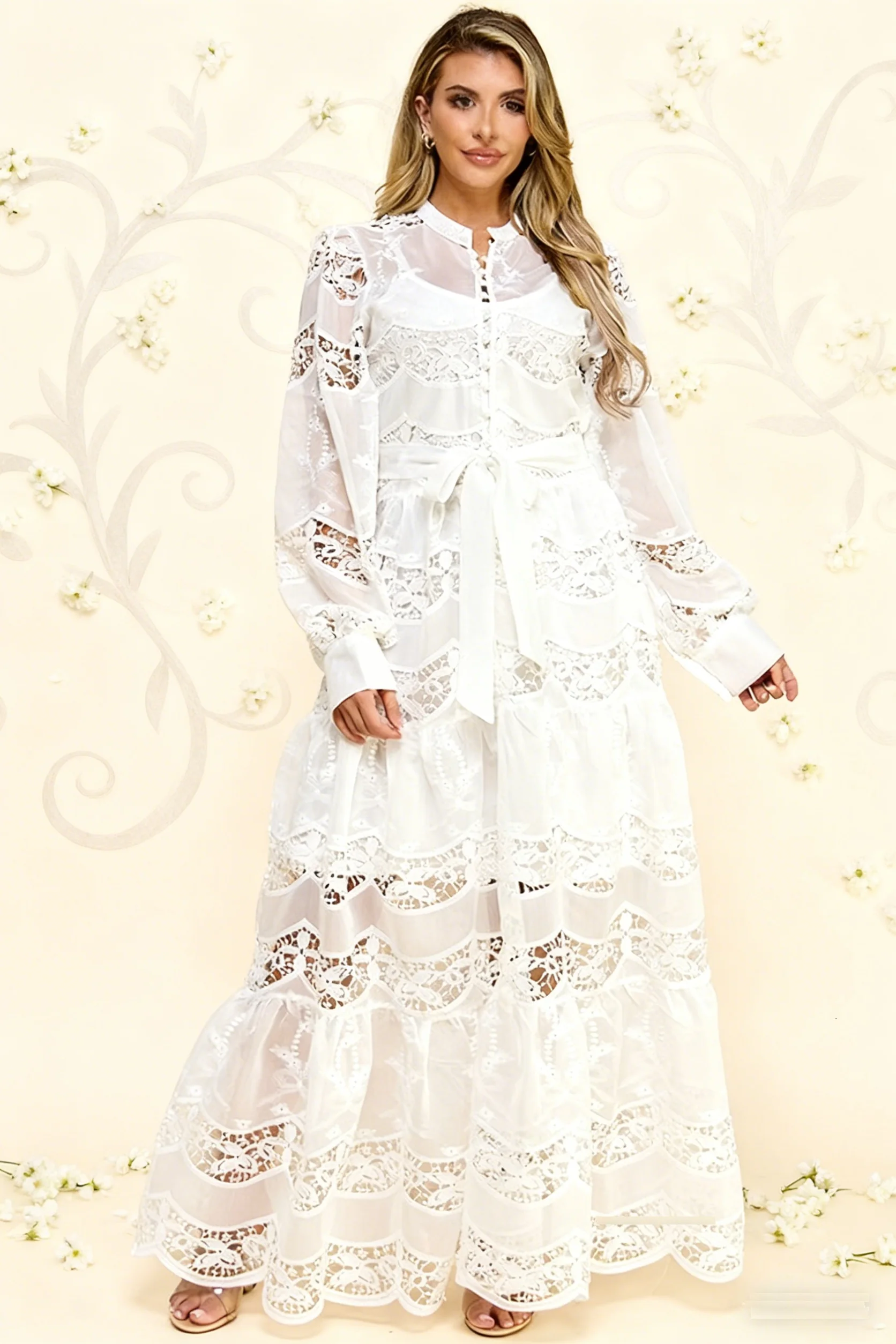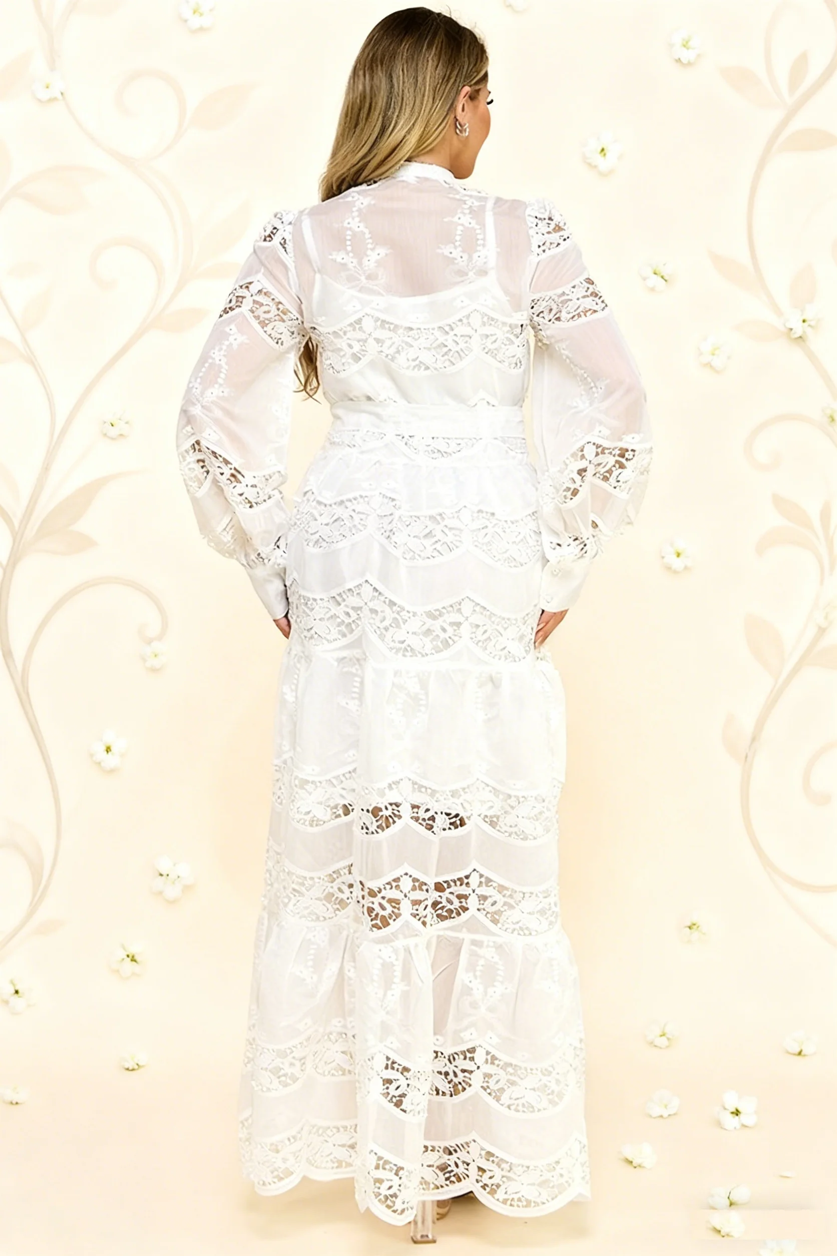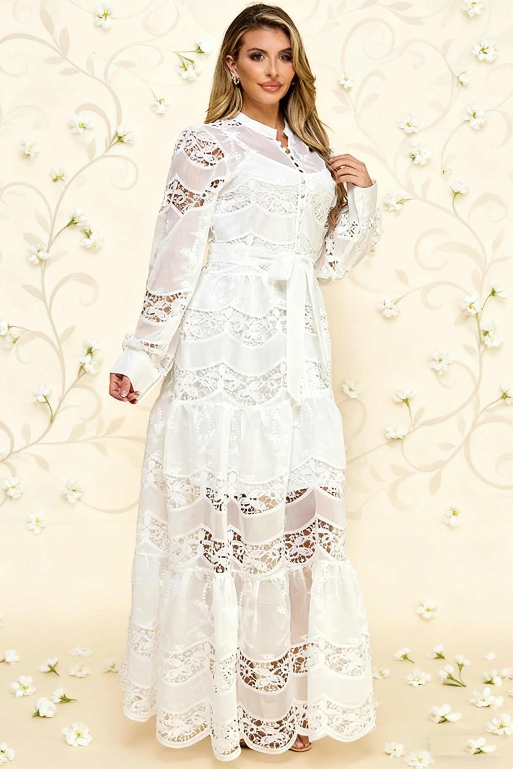 Ladies White Solid Maxi Lace Dress Crocheted Formal High Waist Lantern Sleeves Button Decoration Sweet Autumn Commuting Shopping