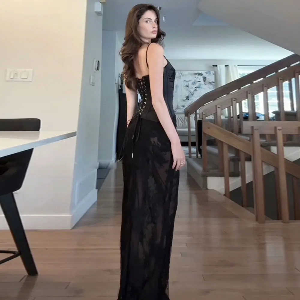 Custom OEM New Women's Dress Set Black Lace Embroidery Two Piece Vest Tops Maxi Long Skirts Women 2 Piece Outfits Skirt Set