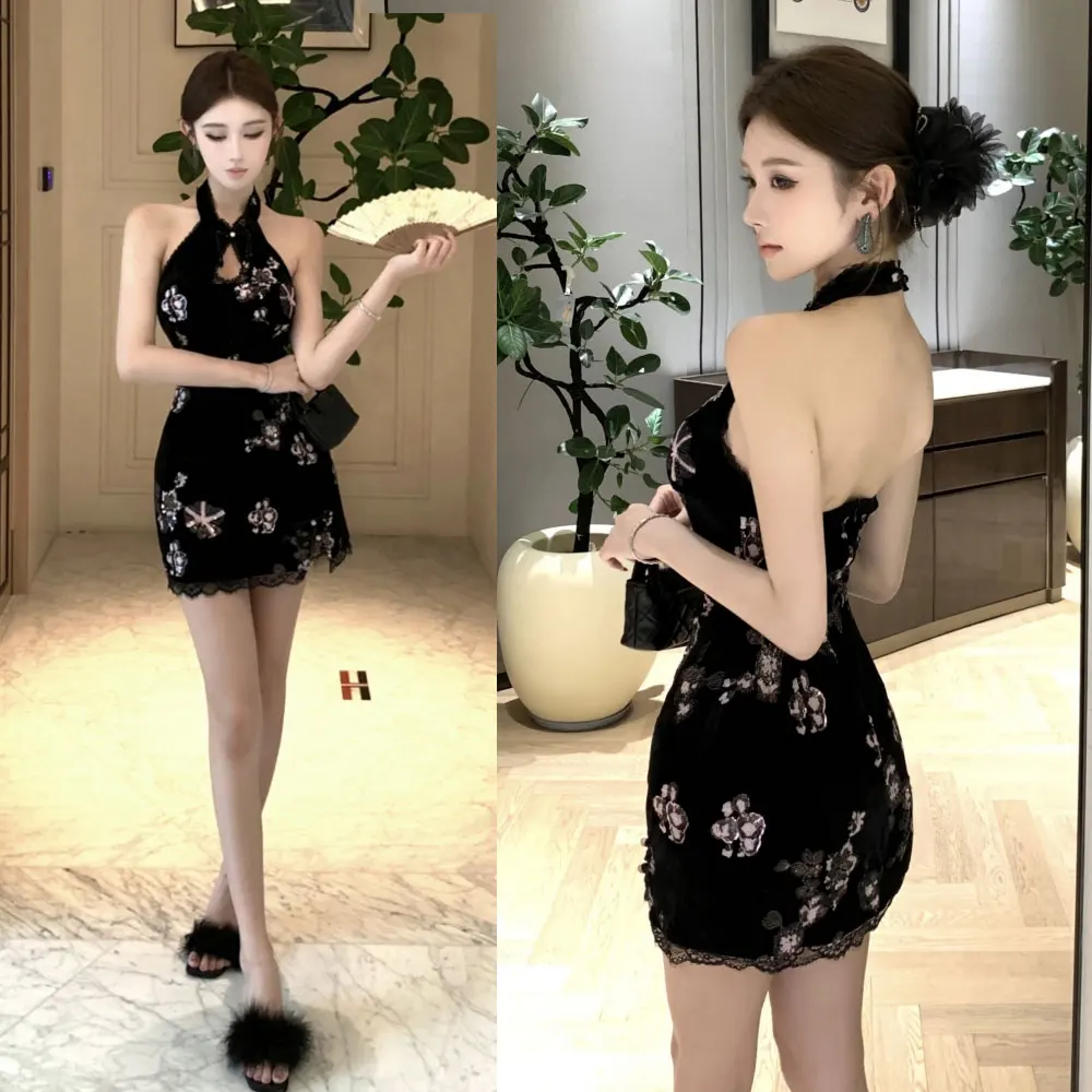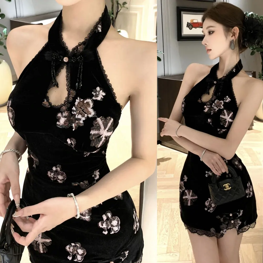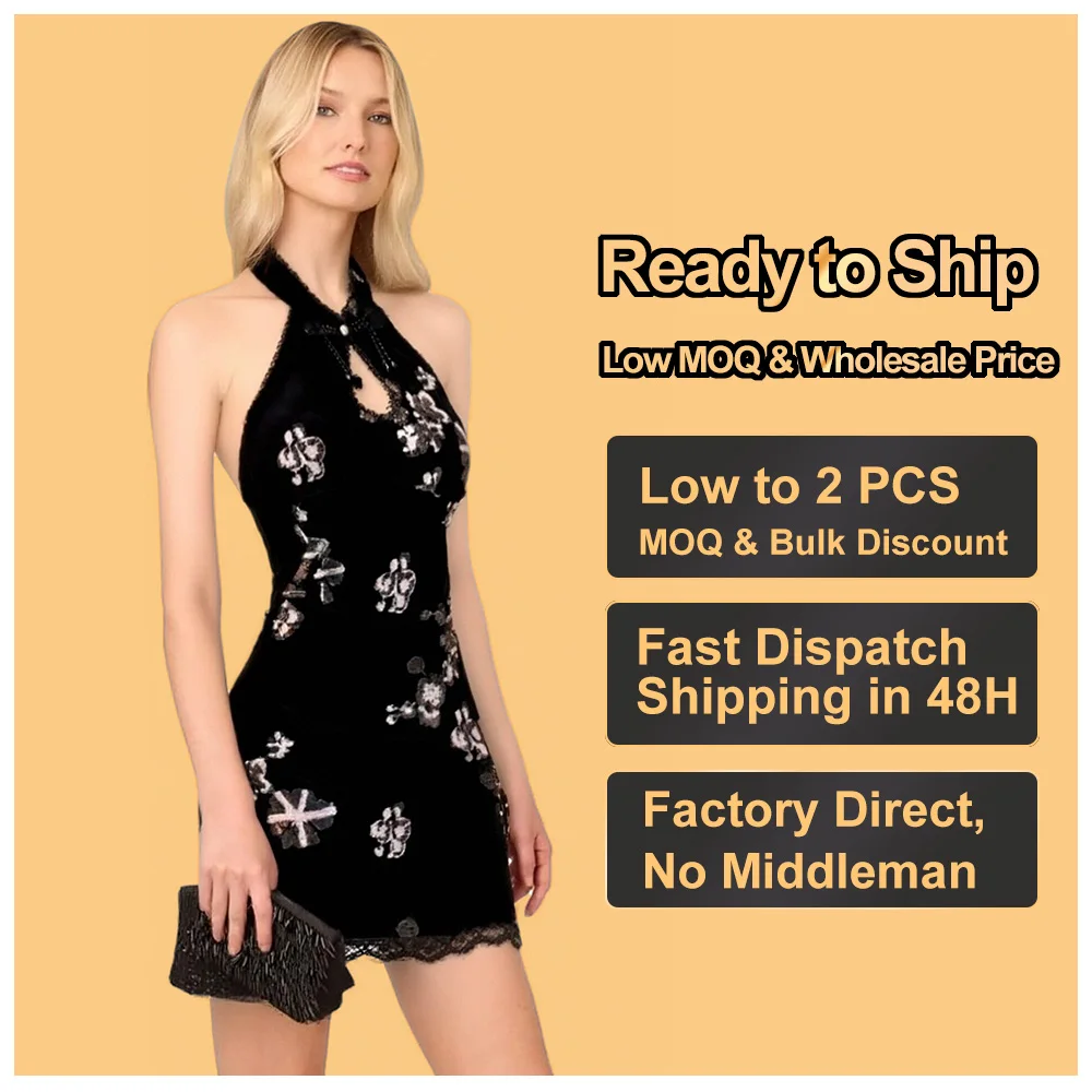Custom Wholesale Women's Sparkly Party Dresses Sequin Mini Velvet Gown Elegant Sleeveless Bodycon with Lace Clubwear Ready Stock