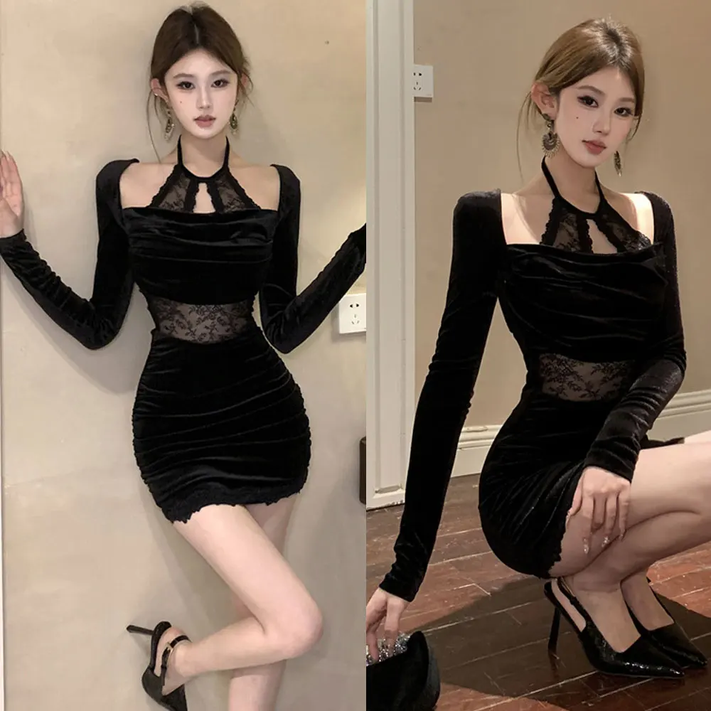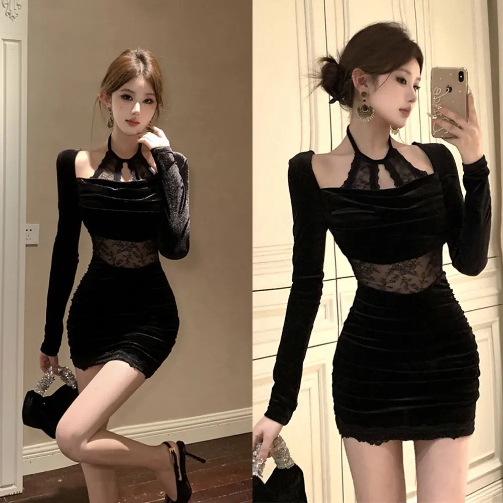 Custom Wholesale Women's Elegant Casual Dress Velvet Stitching Lace Hollow Hanging Neck Long Sleeve Tight Drawstring Short Dress
