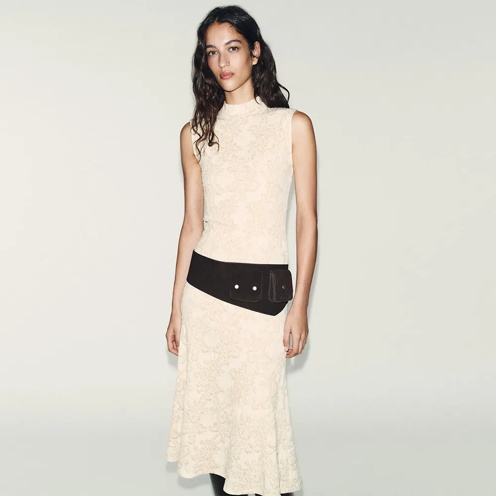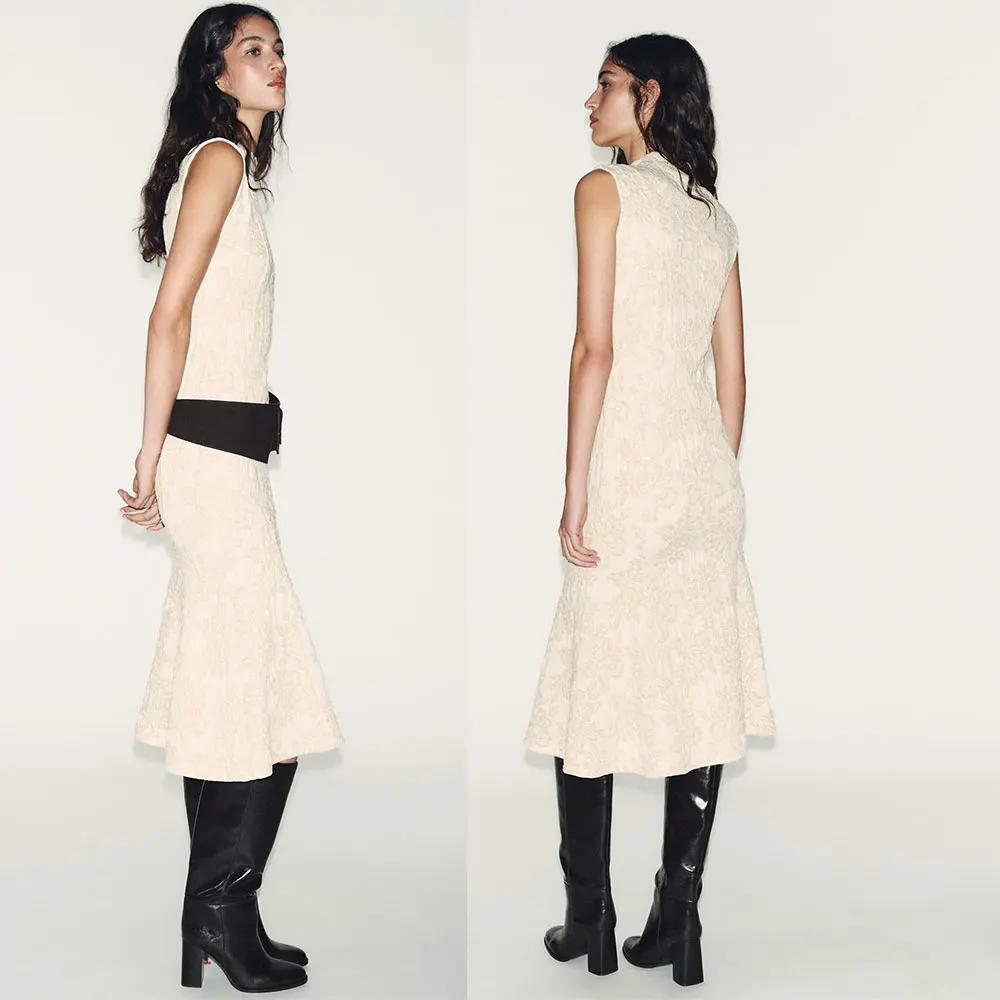 Custom Wholesale Winter New Women's Casual Anti-Static Sleeveless Half High Collar Metallic Flower Jacquard Knitted Dress