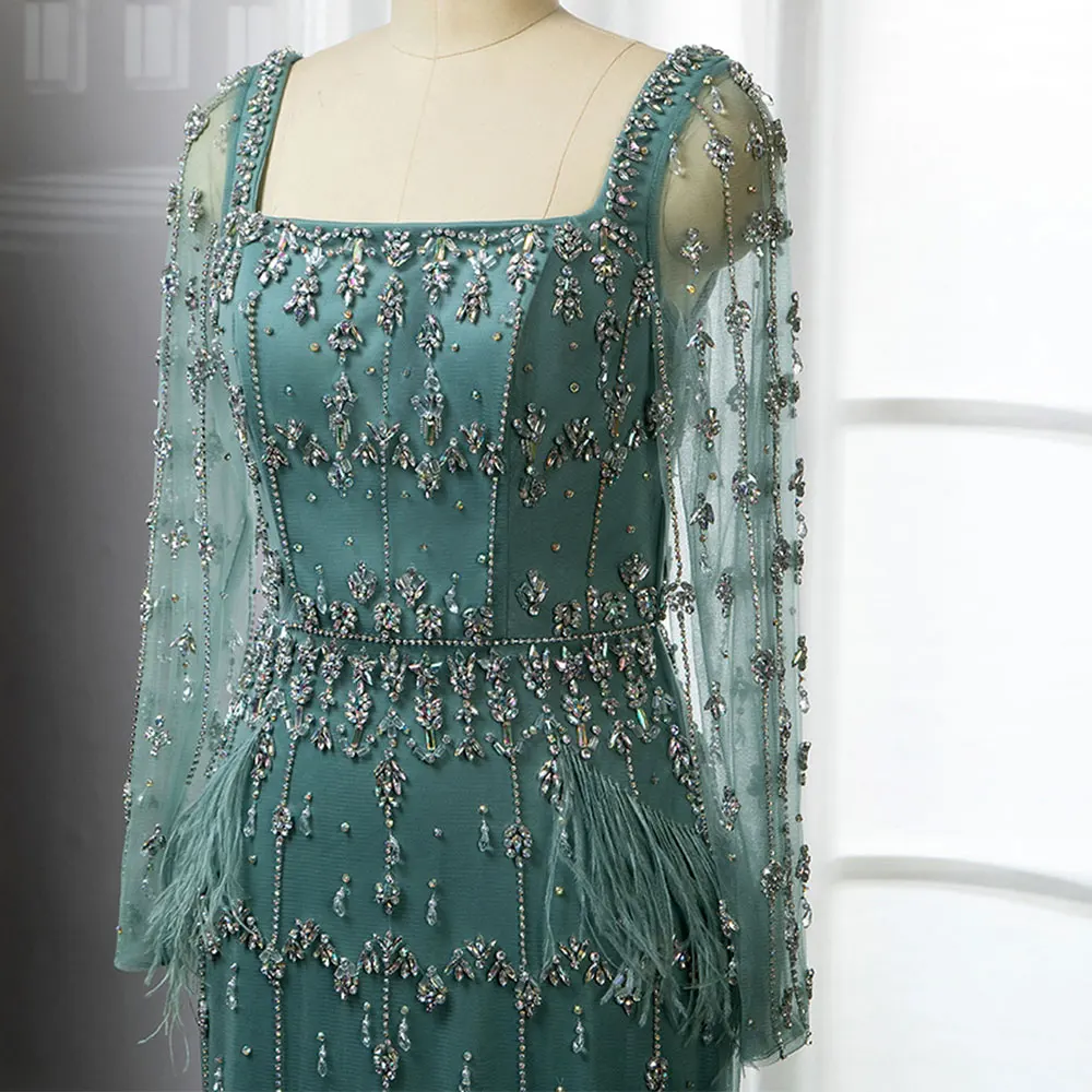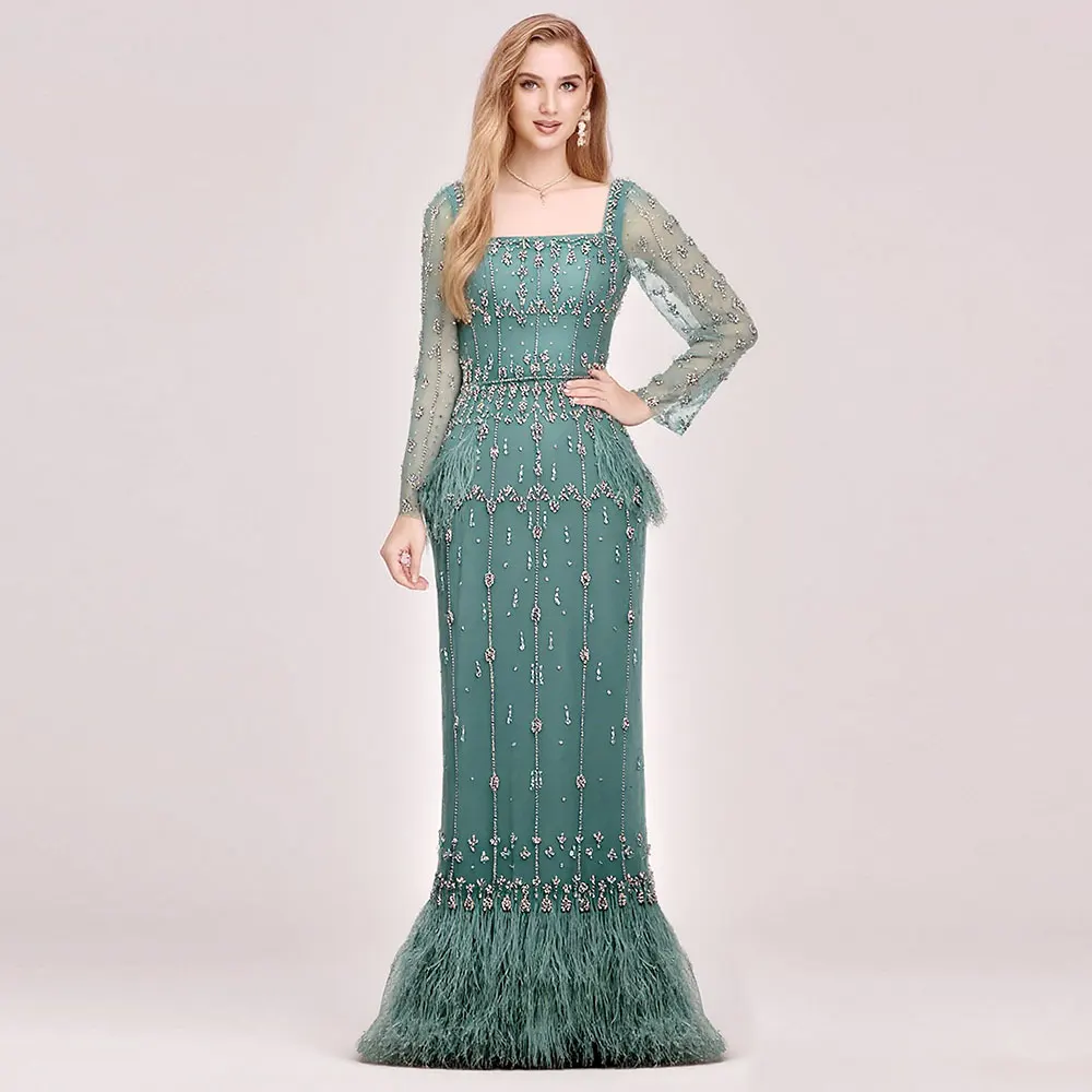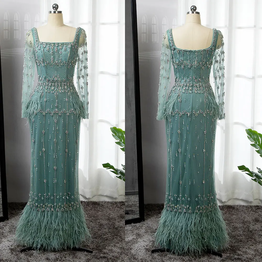 Custom Wholesale Women Turquoise Feathers Beaded Long Sleeves Mermaid Party Gowns Elegant Tropical Rhinestone Evening Dresses