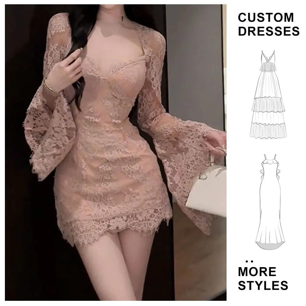 Custom Wholesale 2025 Summer Y2K V Neck Slim Hip Midi Dress for Women Long Sleeve Empire Night Club Lace Dress