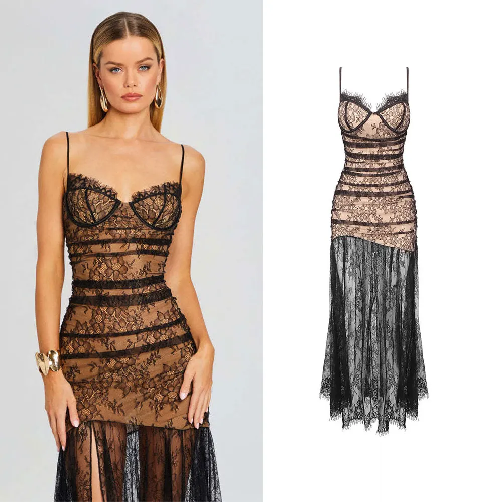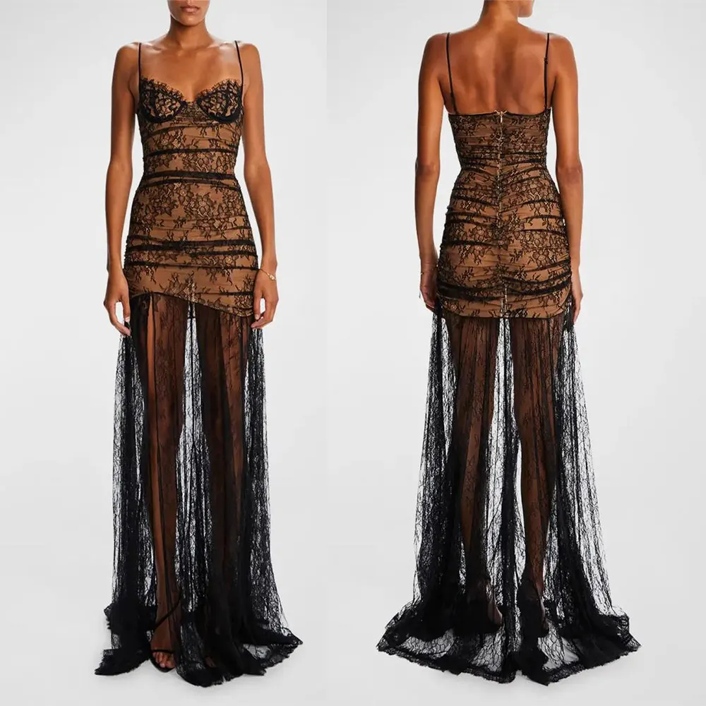 Custom LOGO OEM Women New Fashion Elegant Black Pleated Lace Halter Sleeveless Long Dress Women's Evening Dress