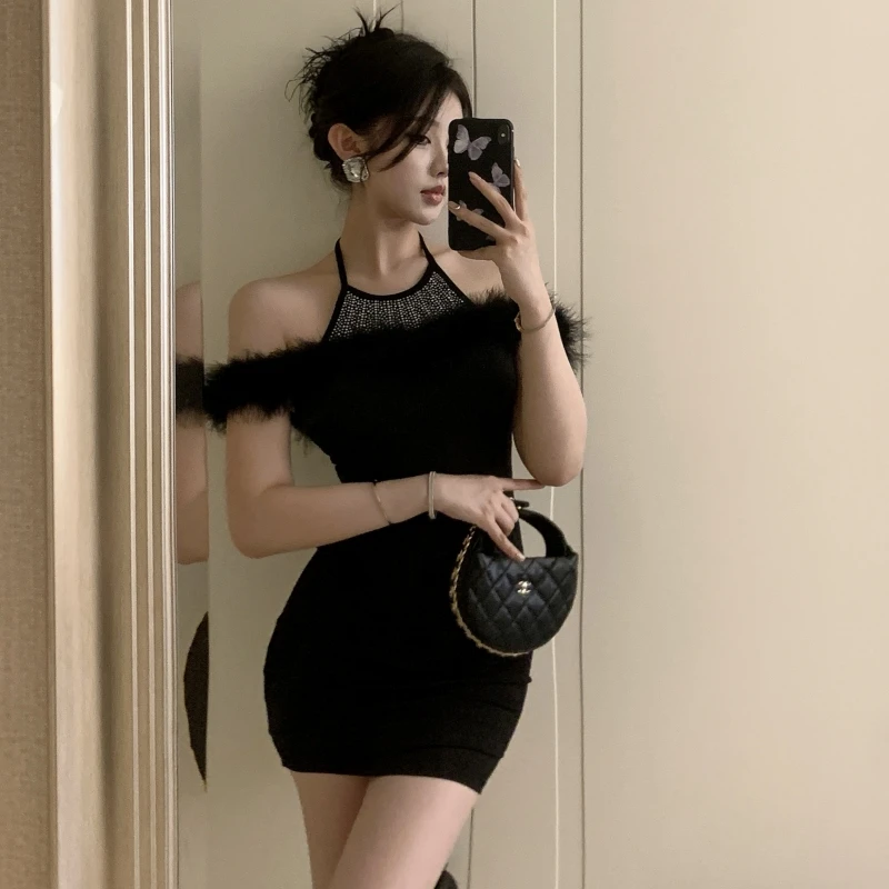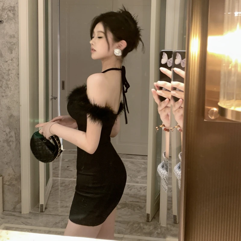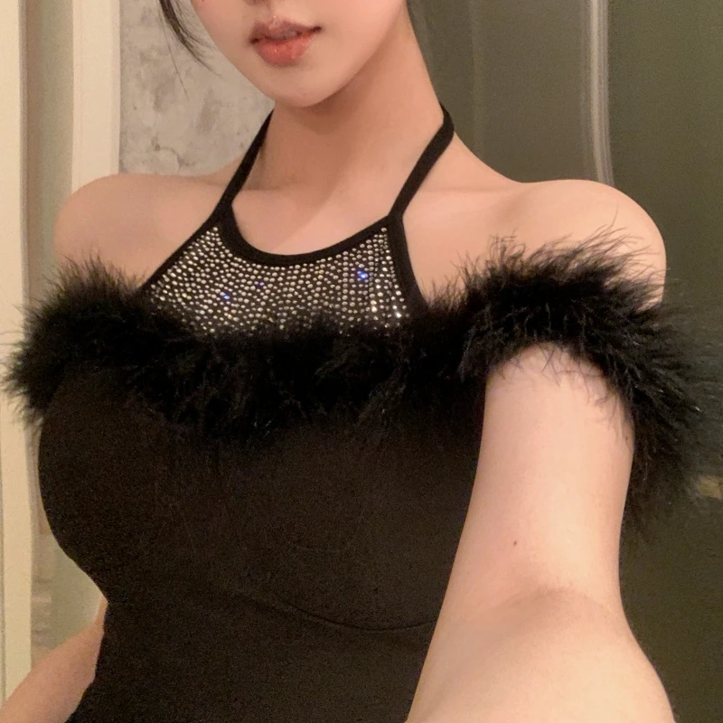 This Black Halter - Neck Evening Dress with Fluffy Fur Trim and Sparkles Exudes Luxury Ideal for Grand Events