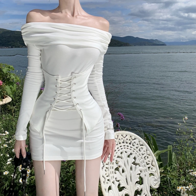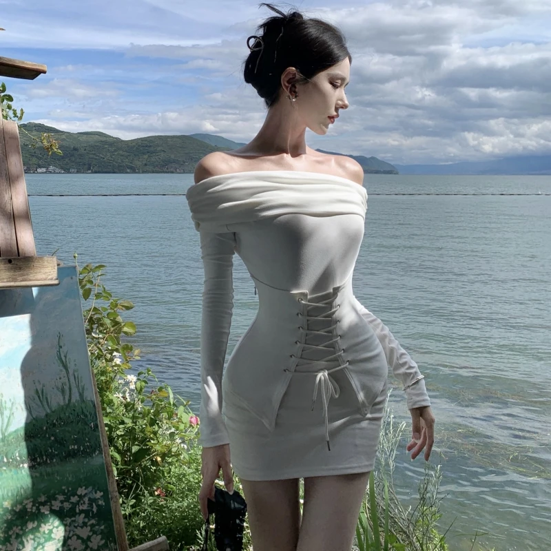 Women's Long-Sleeve Knit Off-the-Shoulder Tight Mini Dress - Slim-Fitting, Perfect for Spring & Autumn Daily Casual Wear