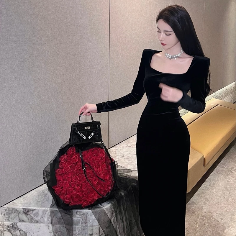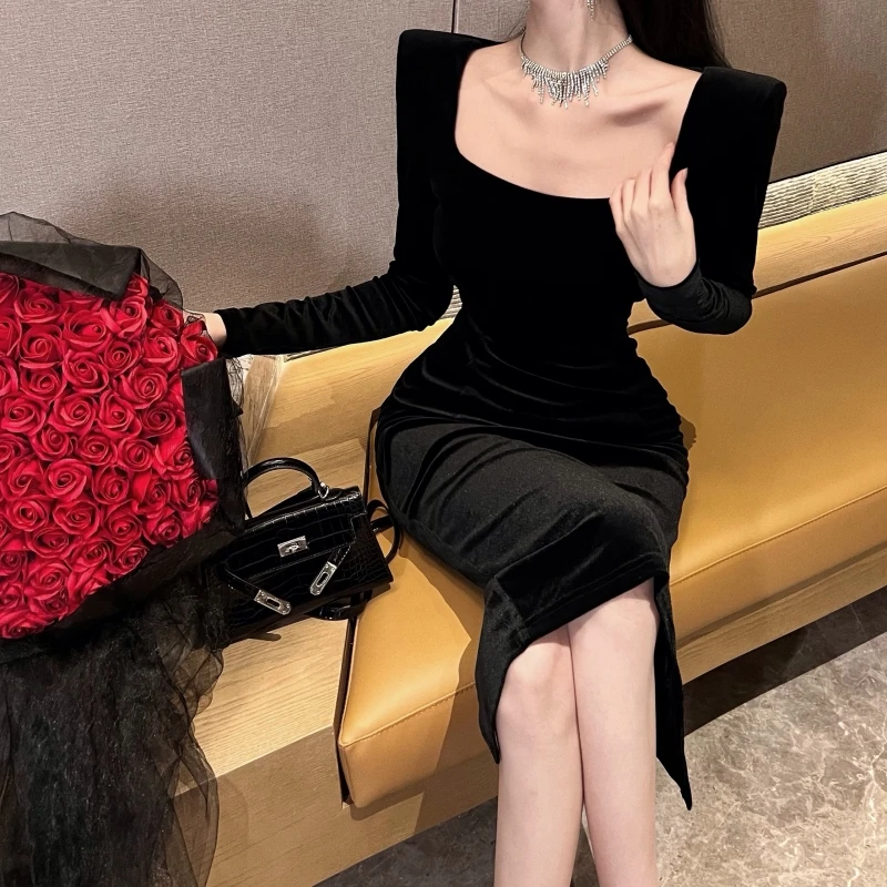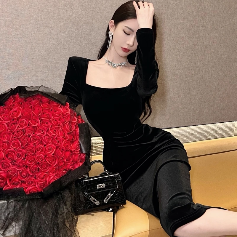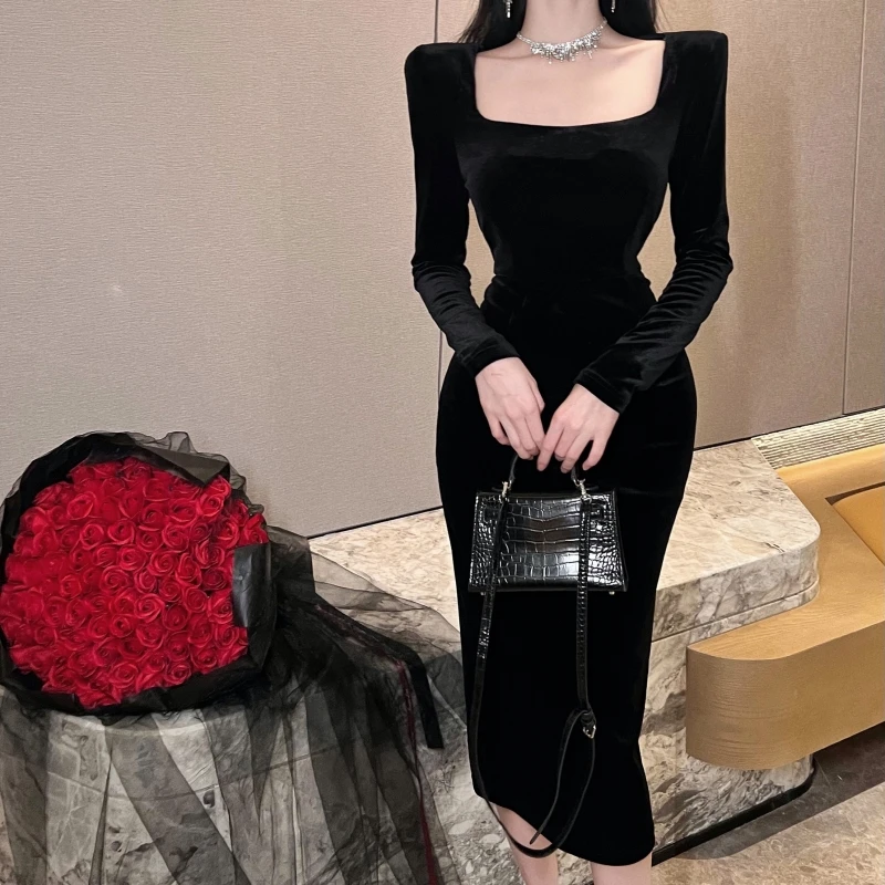 Women's Long-Sleeve Square-Neck Gold Velvet Pencil Dress - Calf-Length, Casual & Slimming for Daily Wear