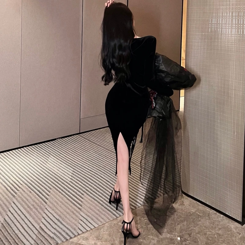 ZYHT 15325 Wholesale Spring Trendy Fashion Long Sleeve Dinner White Lace Black Velvet Elegant Party Dress Women Evening Dresses