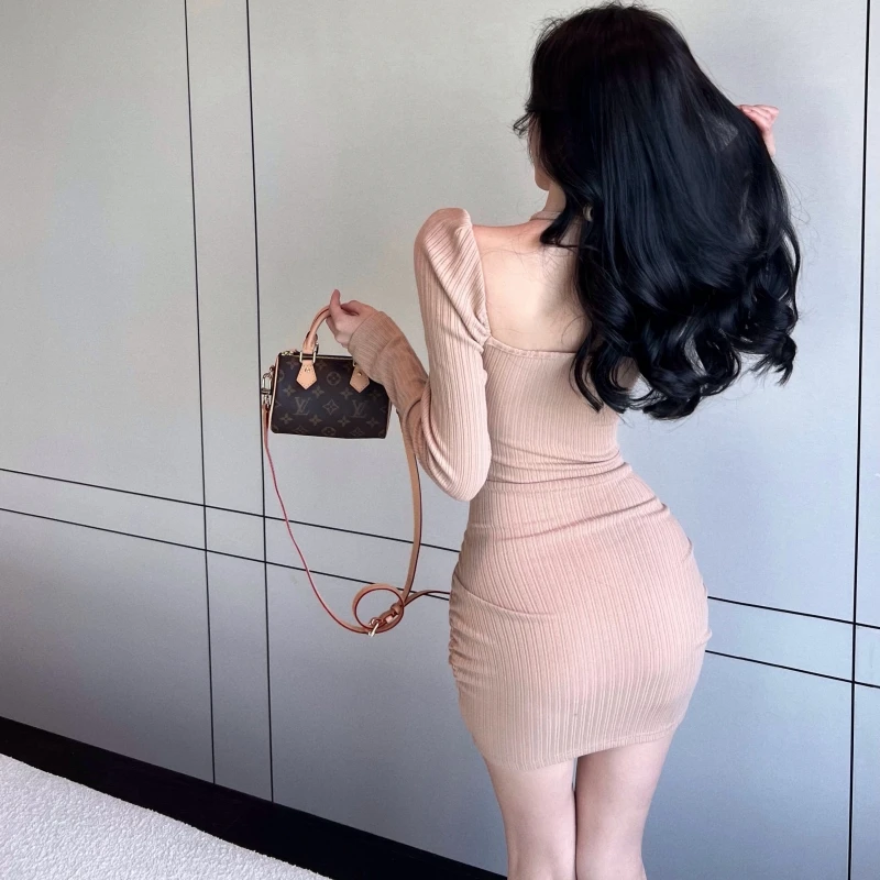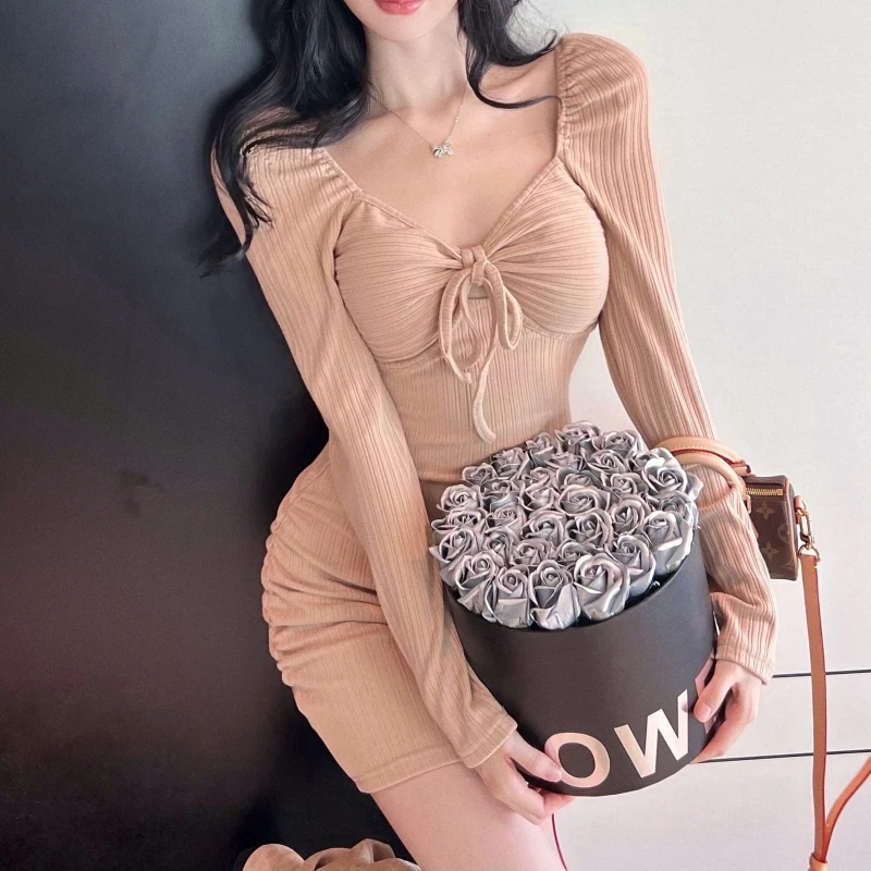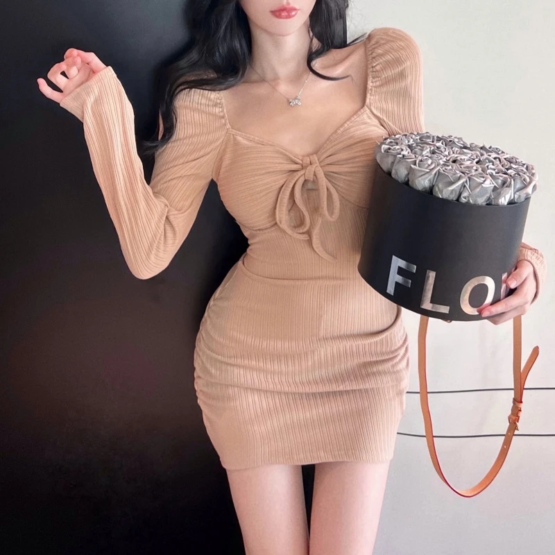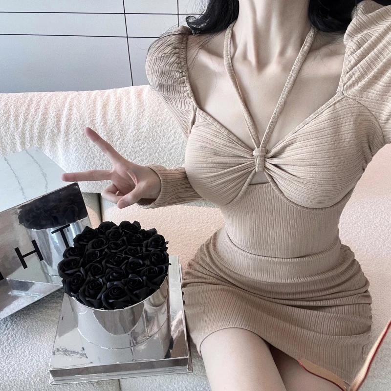 Khaki Knitted Cotton Long Sleeve Mini Dress Hanging Neck Square Collar Tight Fitting-Comfortable for Spring Autumn Slits