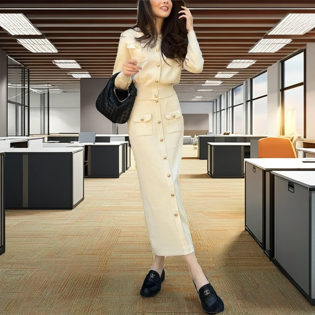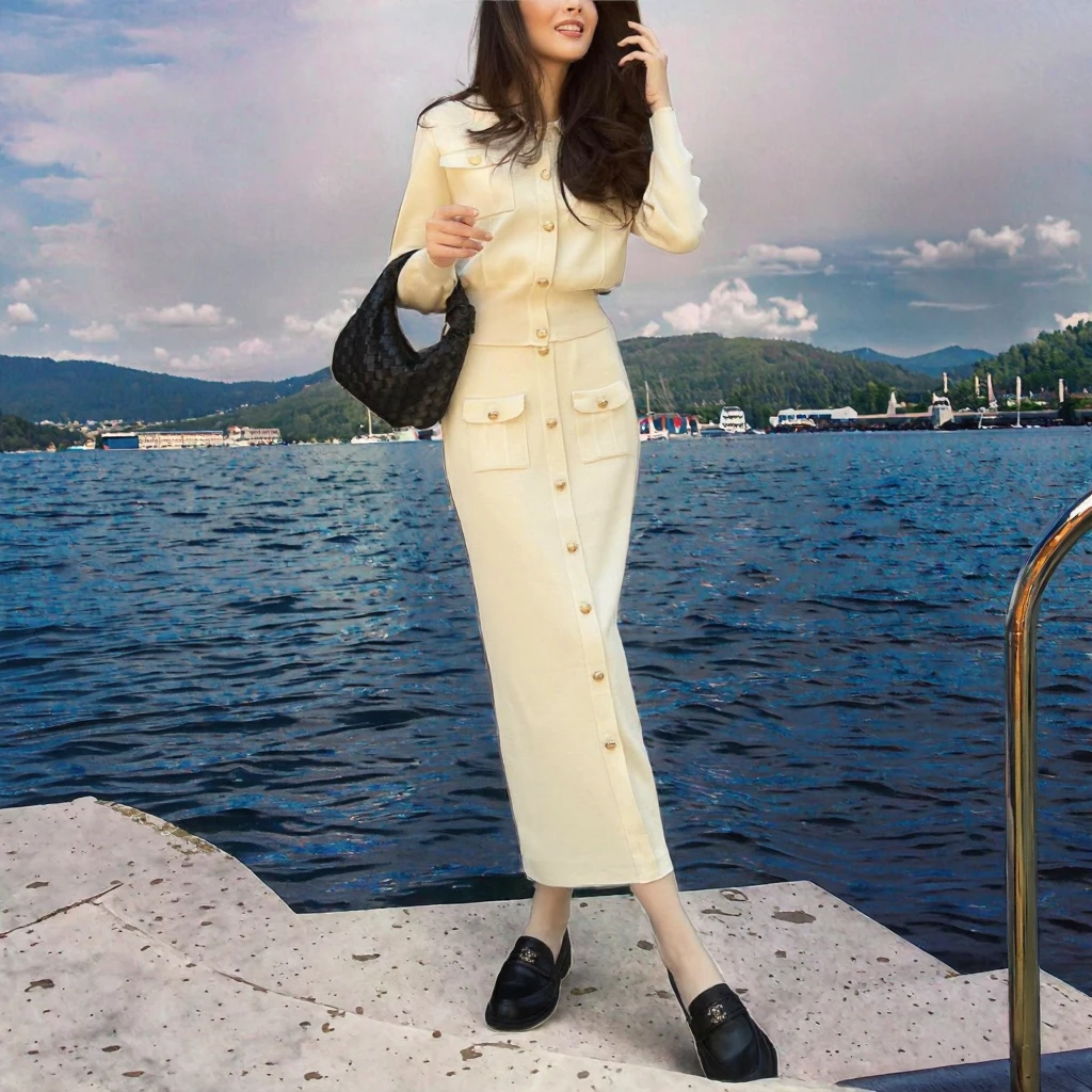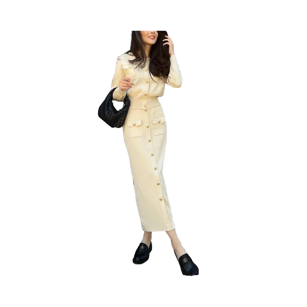 Customize Celebrity Solid Casual Nonwoven Two Piece Knitted Suit Custom Logo Soft Button Long Skirt Breathable Factory Directly