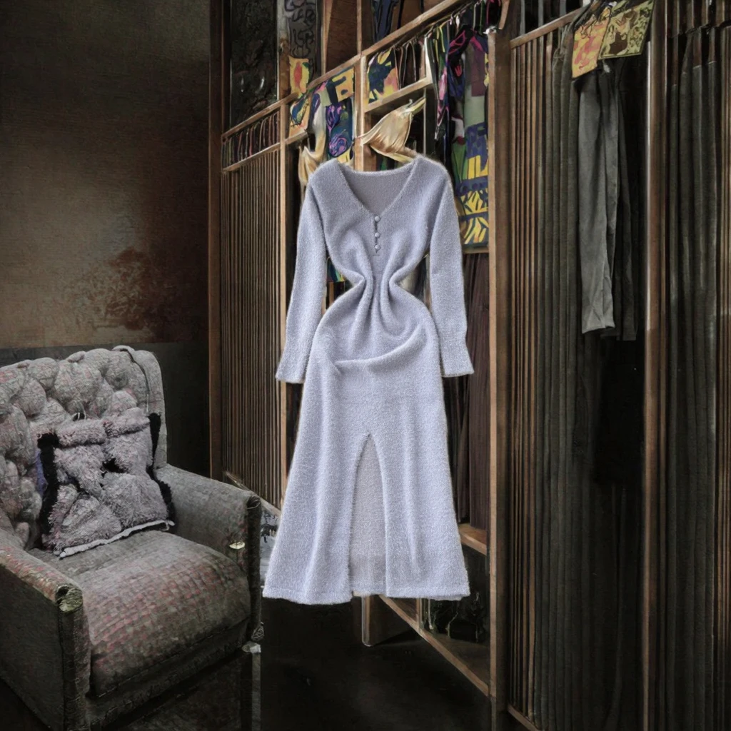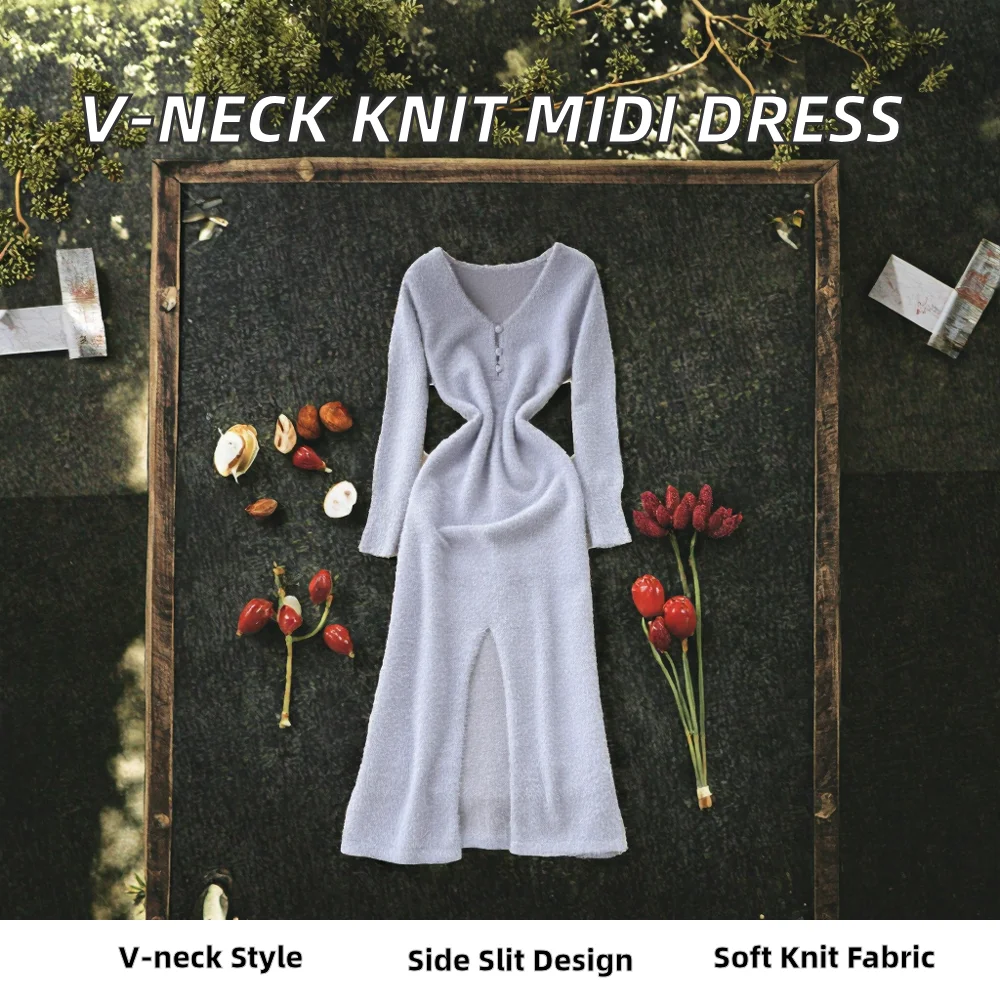 Customize Winter Sustainable Anti-Static Breathable Washable Elegant V-Neck Slit Tunic Knit Midi Empire Dress for Women
