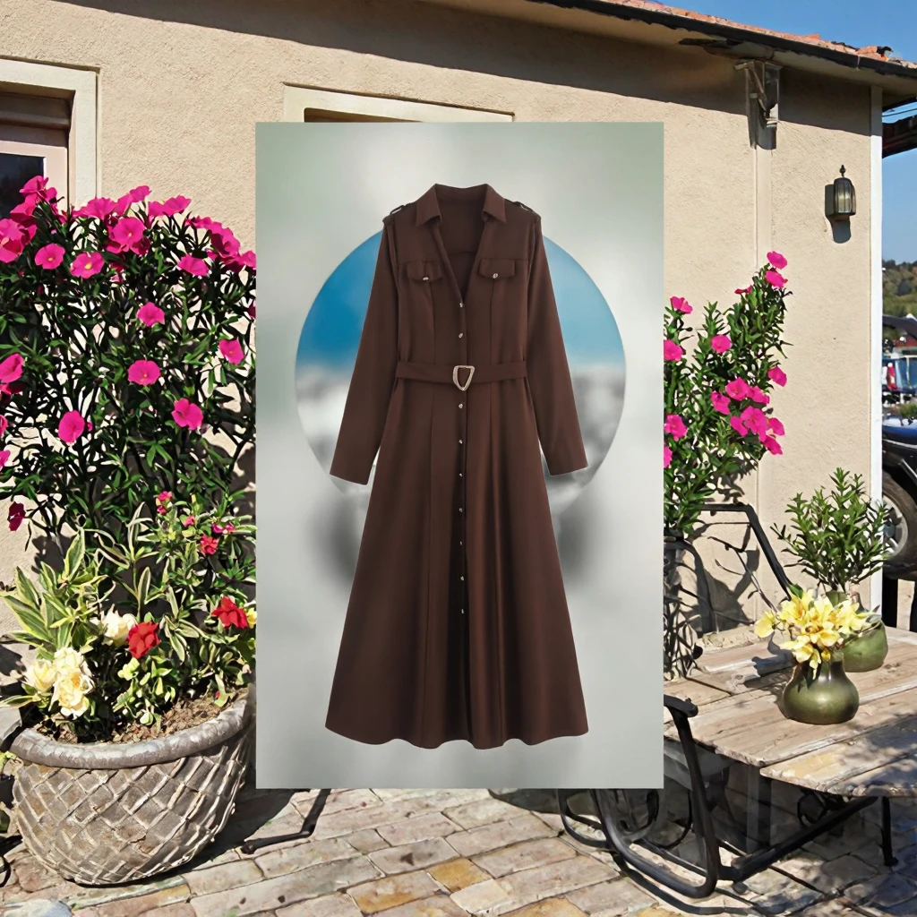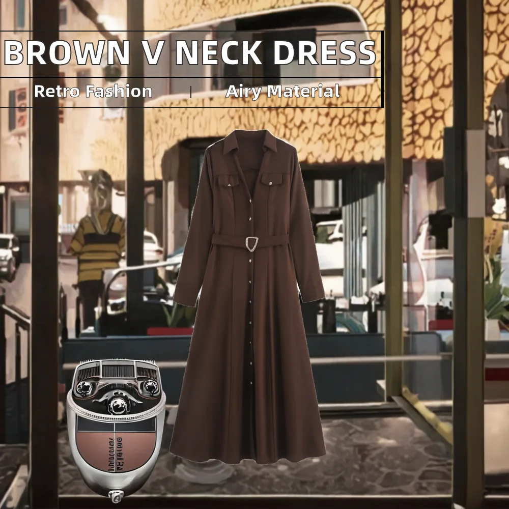 Customize Brown V Neck Button-Up Long Sleeve Sashes Casual Natural Waistline Solid Breathable Summer Shirt Dress for Women