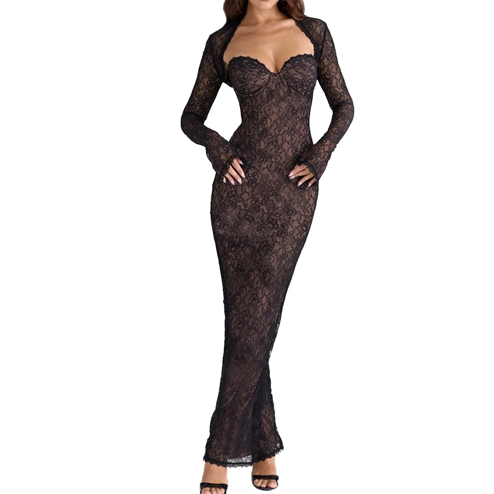 Customize Sexy Simple Breathable Ladies Black Lace Print Midi Evening Dresses for Women with Natural Waistline Pencil Silhouette