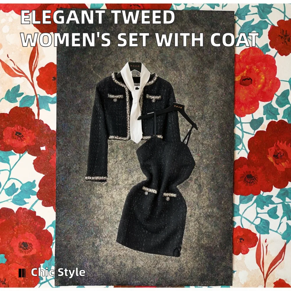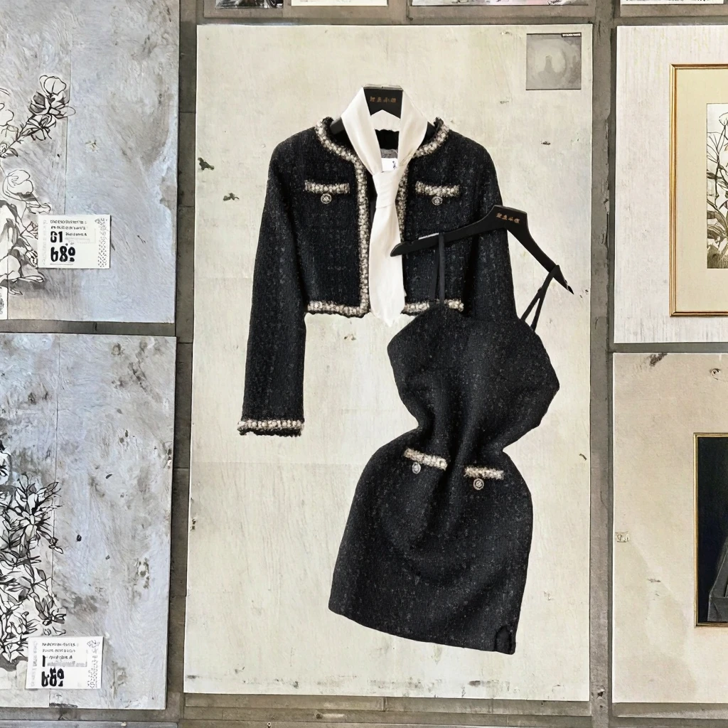 Customize French-Style Elegant Two-Piece Casual Set Solid Pattern Tweed Short Coat Button Decoration Fashionable Camisole Dress