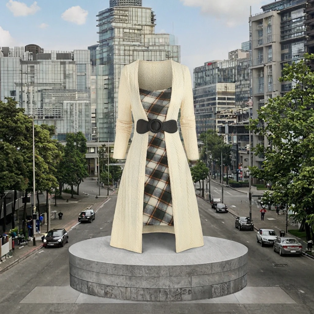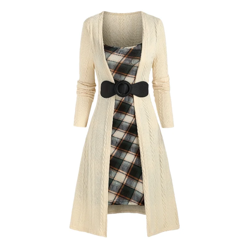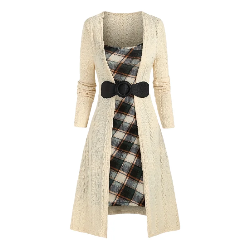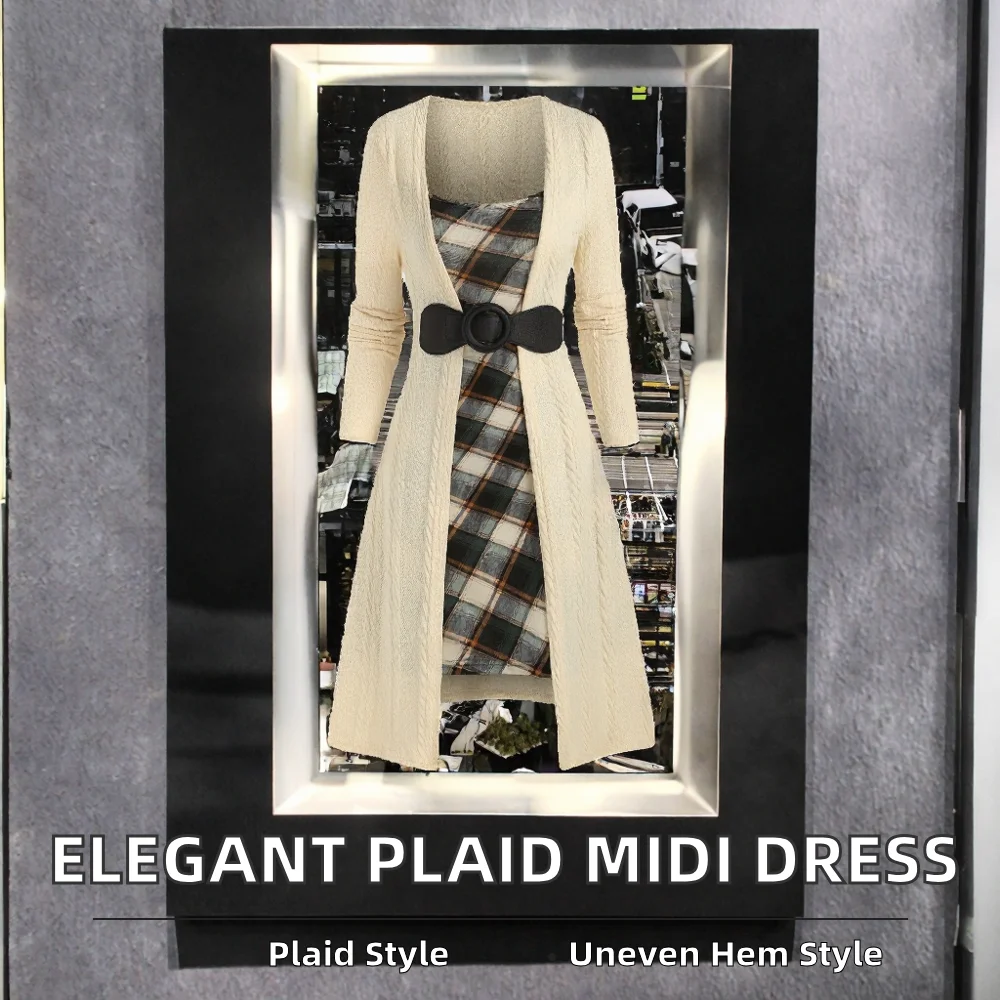 Customize Women's Spring Autumn Elegant Color Blocking Plaid Square Collar Bow Patchwork Asymmetrical Hem Midi Long Sleeve Dress