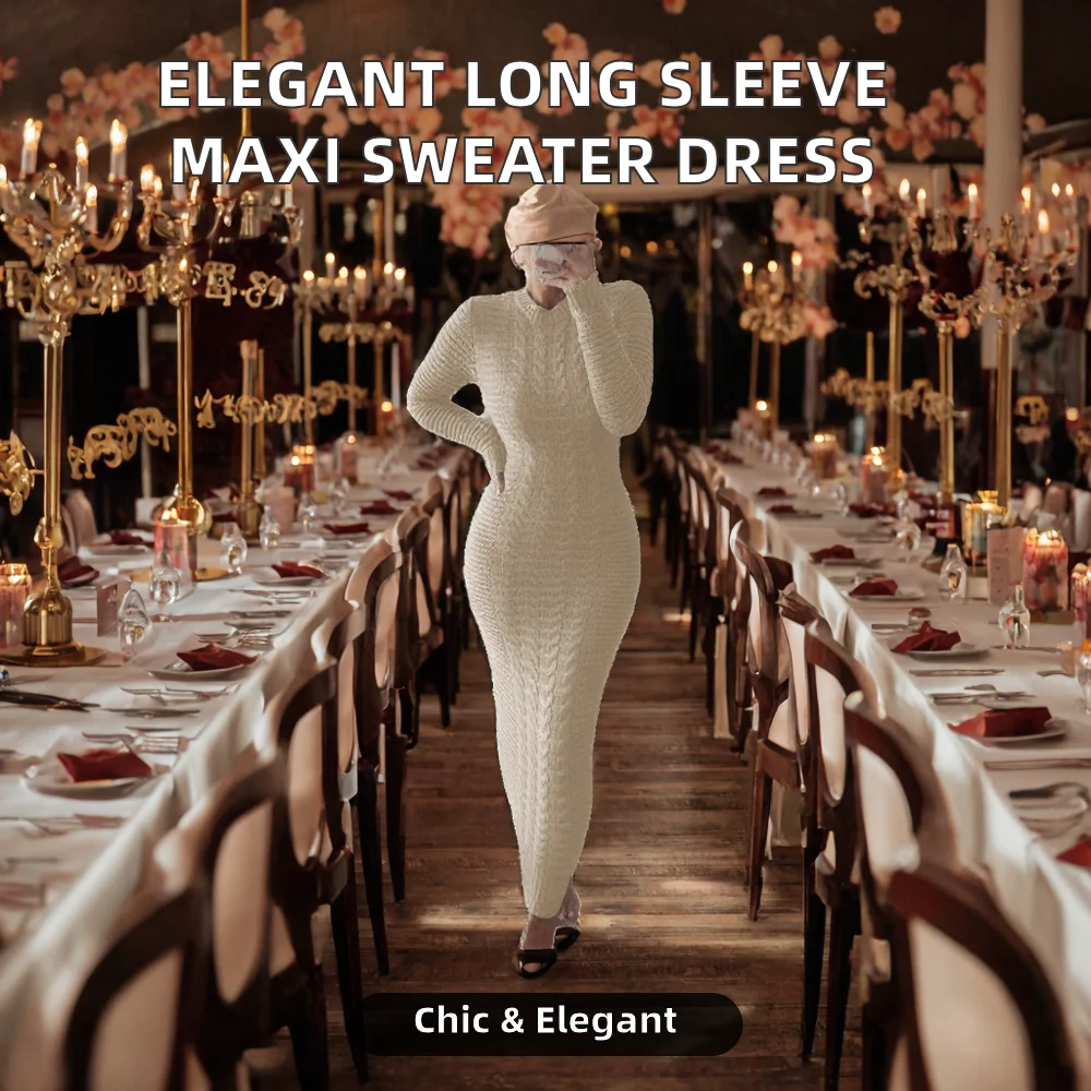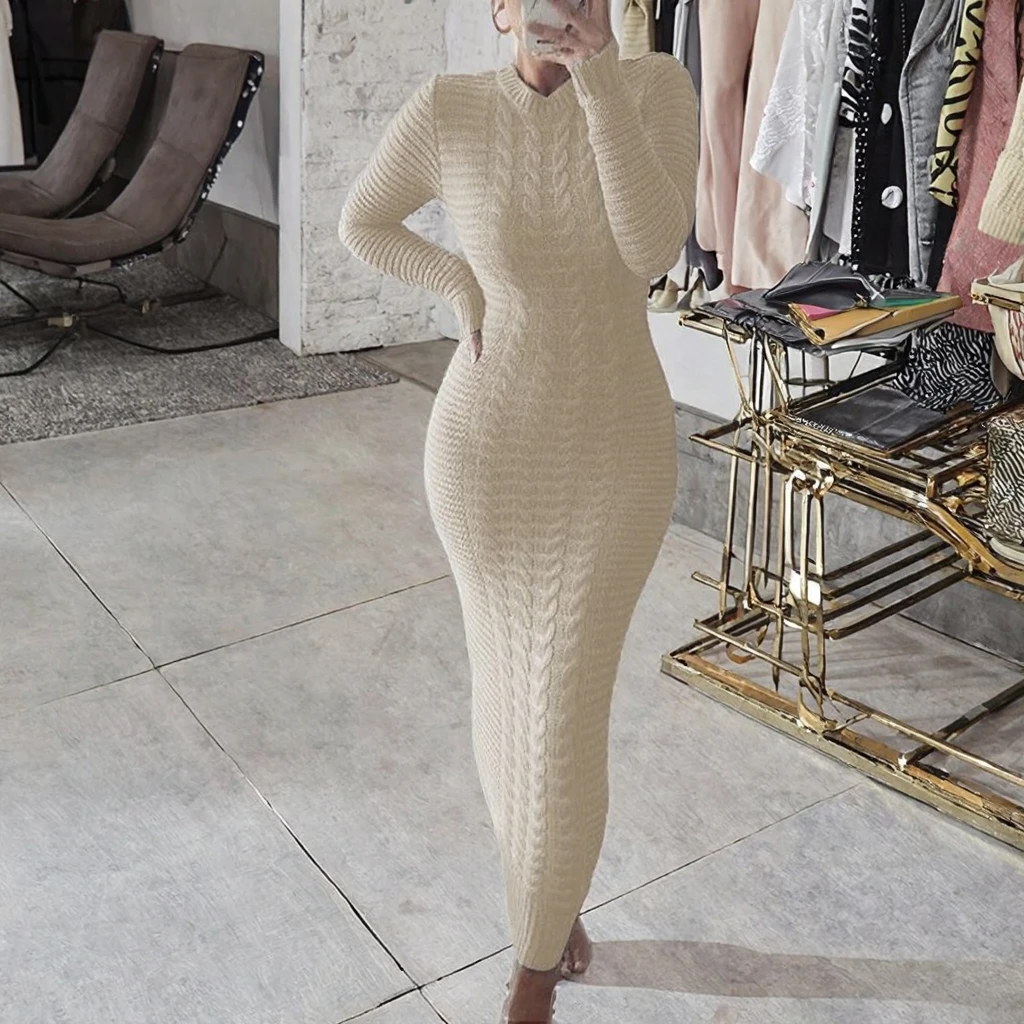 Customize New Stylish Women Autumn Plain Dyed Natural Knitted Solid Long Sleeve Maxi Dress Casual Sweater